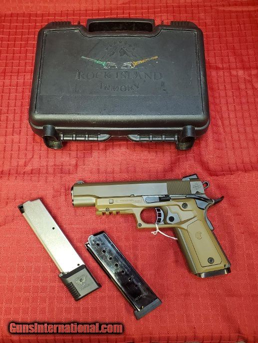 Description: Guns Listing ID: 493791 ROCK ISLAND ARMORY 1911 - .45 ACP - 8 ROUNDS - 4.85 \" **Beautiful ReCover Tactical CC3P Grip and Rail System - see pics** Built in a classic 70 series design Chambered in .45ACP and an eight round capacity Smooth, angled and snag-free style Includes low profile, angled rear sight and skeletonized hammer and trigger Adjustable over travel stop Ambidextrous safety standard ODG Ceramic Finish 4-to-6-pound trigger Semi-Auto Manufacturer: ROCK ISLAND Model: 1911 - OD GREEN Caliber: .45 ACP Magazines: TWO - 8 ROUND MAGS Sights: FIXED - REAR GREEN HIGHLIGHTED Weight: 3.71LBS Overall Length: 8.75\" Barrel Length: 4.85\" SERIAL NUMBER: RIA2275736 SKU NUMBER: DJ1026281 SOLD Manufacturer: ROCK ISLAND ARMORY Model: 1911 Caliber Info: .45 ACP Condition: Used - Non-Certified Barrels: 4.85 Finish: od green |