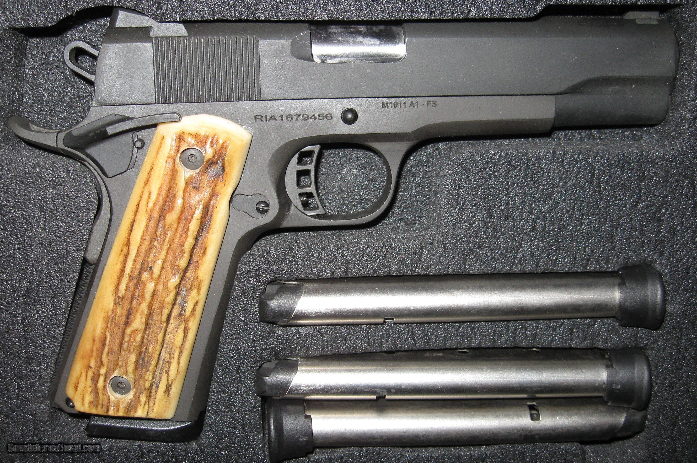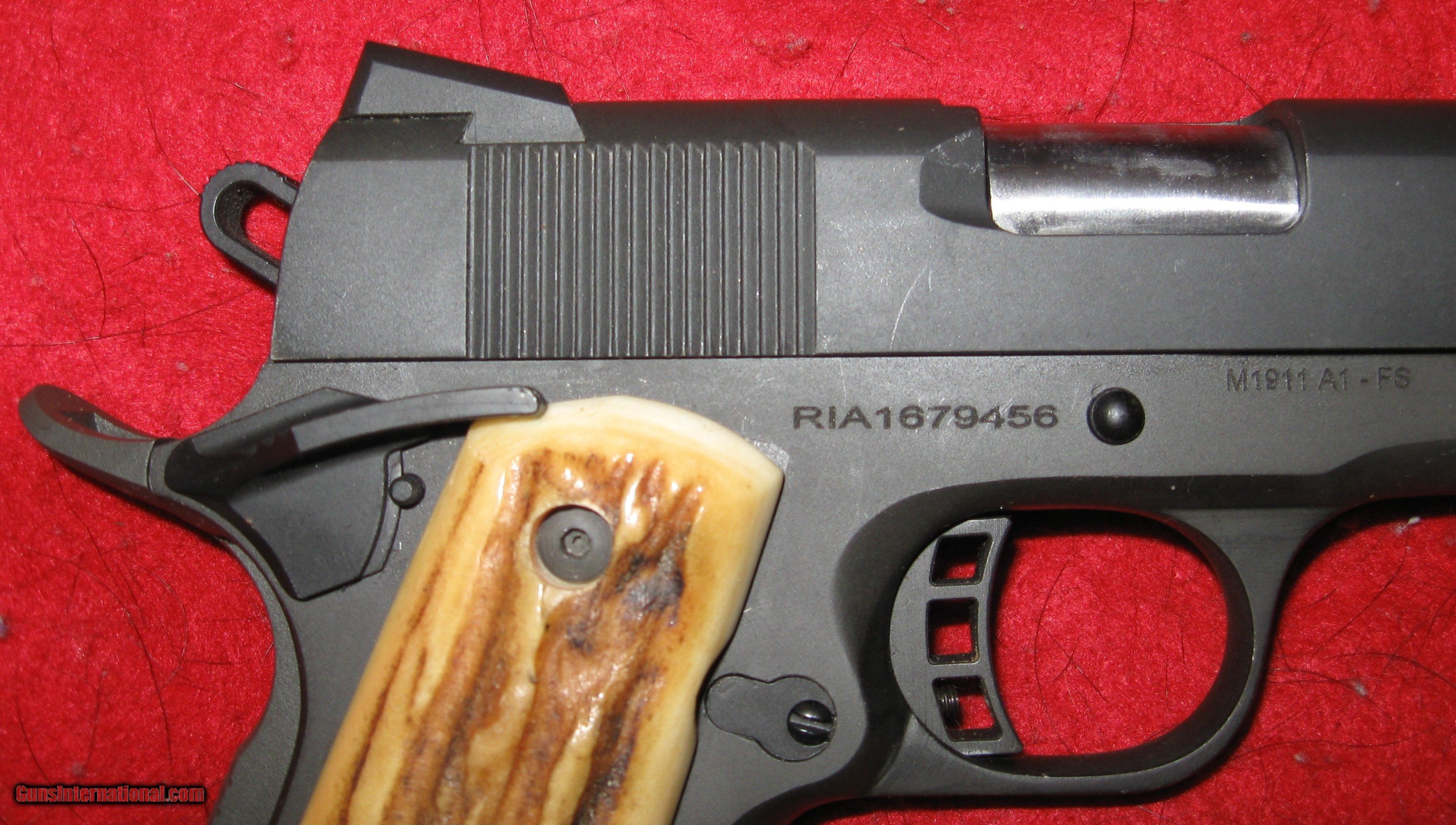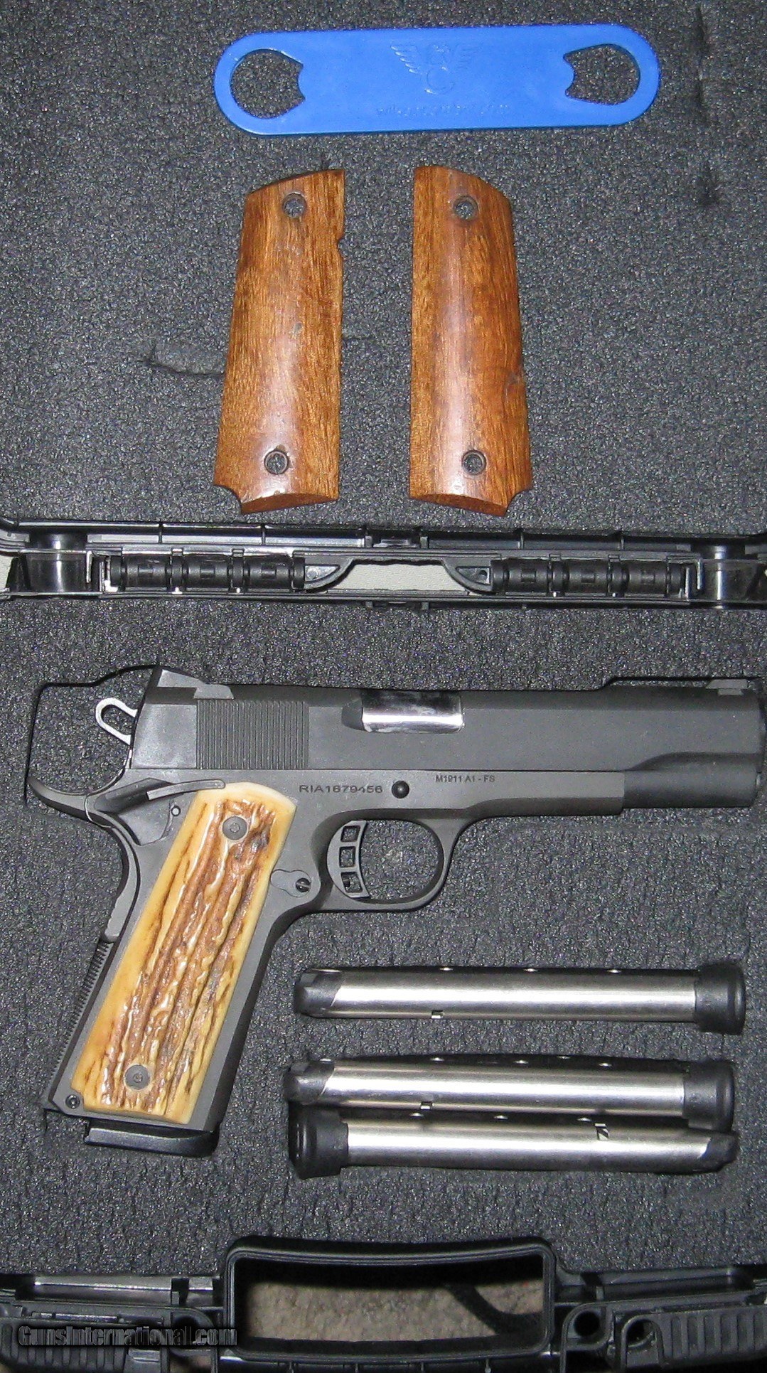 Description: THIS ROCK ISLAND ARMORY PISTOL IS THE 1911 A1 FS TACTICAL MODEL SERIAL # RIA1679XXX. IT IS CHAMBERED IN 45 ACP AND IS VERY LIGHTLY USED (ABOUT 200 ROUNDS SINCE I BOUGHT IT). IT IS IN EXCELLENT CONDITION OVERALL WITH AN EXCELLENT BORE. THIS PACKAGE INCLUDES THE 1911 AI FS TACTICAL PISTOL WITH EXTENDED BEAVERTAIL, STIPPLED BACKSTRAP, GROOVED FRONT STRAP, SKELETON HAMMER WITH DOVETAILED DRIFT ADJUSTABLE FRONT AND REAR SIGHTS. IT HAS A TRIGGER STOP SCREW AND A SET OF WIDER THAN ORIGINAL FAUX STAG GRIPS. IT COMES WITH 4 MAGAZINES (1 ORIGINAL 3 PRO MAG) A BARREL BUSHING WRENCH, IT'S ORIGINAL WOOD GRIPS AND IT'S ORIGINAL CASE. SHIPPING IS $75 MY FFL TO YOUR FFL Handgun Caliber: .45 ACP (.45 Auto) Manufacturer: ARMSCOR/ROCK ISLAND ARMORY Model: 1911-A1-FS TACTICAL Serial Number: RIA1679XXX Barrel Length: 5 Condition: EXCELLENT Metal Condition: EXCELLENT Wood Condition: VERY GOOD Bore Condition: EXCELLENT Action: SEMI AUTO SINGLE ACTION Triggers: TRIGGER STOP SCREW Stock: ORIGINAL AND FAUX STAG Finish: PARKERIZED Sights: DRIFT ADJUSTABLE DOVETAILED FRONT AND REAR Extras: 3 PRO MAG MAGS, BARREL BUSHING WRENCH AND ORIGINAL GRIPS Case: ORIGINAL Grips: 2 PAIR- ORIGINAL AND FAUX STAG WIDE PROFILE Price: $595.00 Shipping: $75.00 Buy Now Contact Seller |