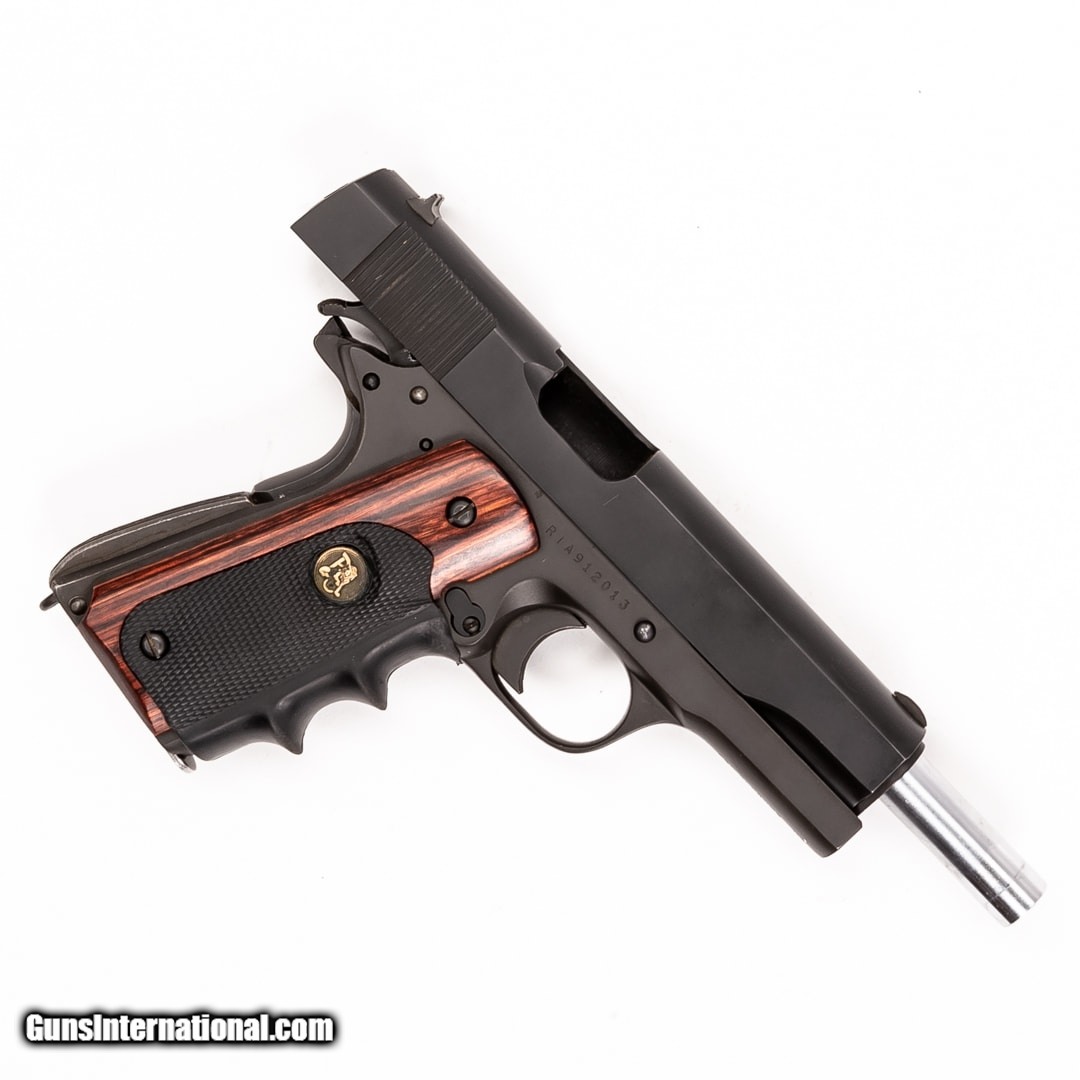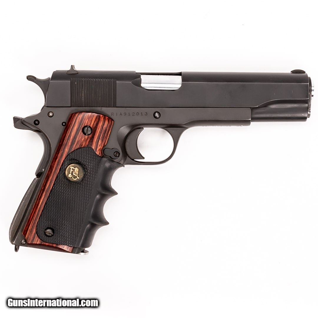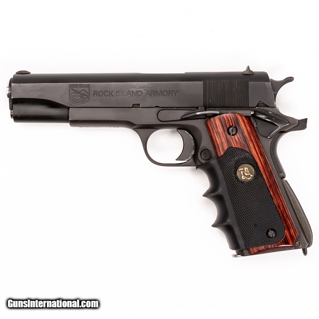 Description: Guns Listing ID: 335850 For sale is a Rock Island Armory 1911 chambered in .45 ACP. It has Pachmayr grips and material added to the grip safety to stop hammer bite. 1-8 round magazine included. SOLD Manufacturer: ROCK ISLAND ARMORY Model: 1911 Caliber Info: .45 ACP Condition: Used - Certified Barrels: 5 BARREL Finish: BLACK |
