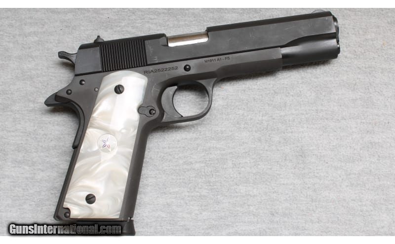 Description: Excellent condition, few light wear and handling marks. Comes with one mag, hard case and 2nd pair of wood grip panels. Classic 1911 type pistol, flat black finish, military type iron sights, standard spur hammer, safety lever and grip safety. .45 Auto SOLD Chambers: Semi auto Metal Condition: Excellent Bore Condition: Bright Barrels: 5 Triggers: Single action Butt Pad: Pearl like grips Sights: Iron sights Item Location: La Vista, NE |