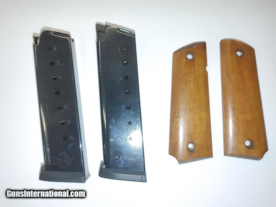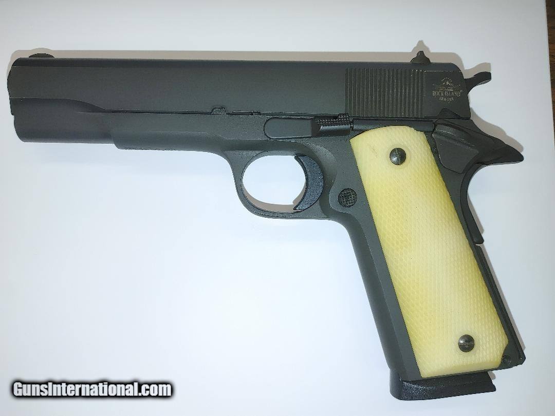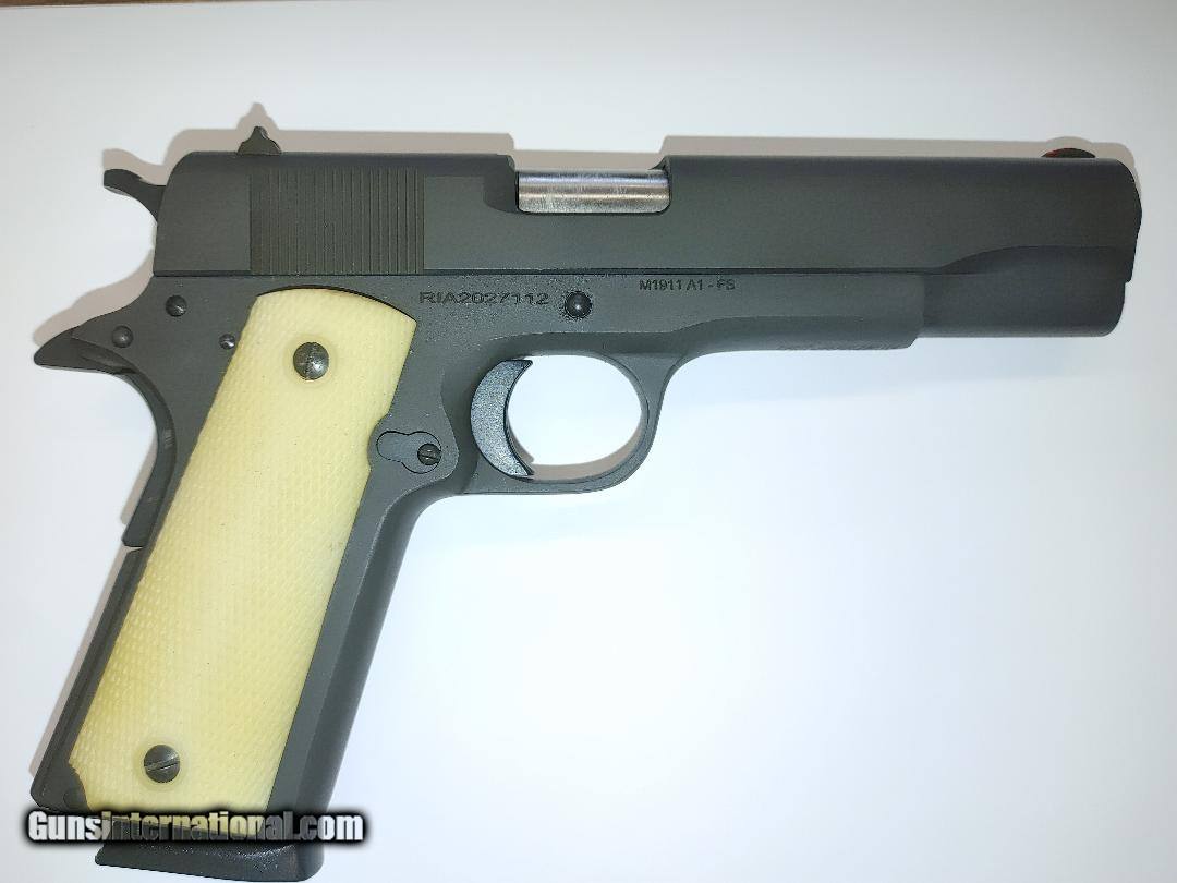 Description: Guns Listing ID: 903321 RED LASER BUILT INTO THE GRIPS Armscor, GI Standard FS, 1911, Semi-automatic, Metal Frame Pistol, Full Size, 45ACP, 5\" Barrel, Steel, Parkerized Finish, Black, Wood Grips, & plastic grips, Fixed Sights, 8 Rounds, 2 Magazines factory box 5\" Barrel 8 Round Capacity Parkerized Finish, Black 4-6 LB Trigger Pull Product Description The M 1911 GI standard is a great representation of the original US GI combat issue 1911 and is chambered in 45 ACP and built with their exacting engineering standards. Fixed, low profile sights and traditional smooth slim design are perfect for quick pull holster use. A durable parkerized finish gives it a tough, smooth, non-reflective surface. Smooth wood grips offer comfort in both feel and design. The 5\" barrel offers a balanced weight to assist with the accuracy and recoil that made the original 1911 design famous. True to all Rock Island 1911s, the GI Standard comes with a crisp factory 4- to 6-pound trigger for a great experience right out of the box. SOLD Manufacturer: ROCK ISLAND ARMORY Model: GI STANDARD FS CA COMP Caliber Info: .45 ACP Condition: Used - Non-Certified Barrels: 5 BARREL |
