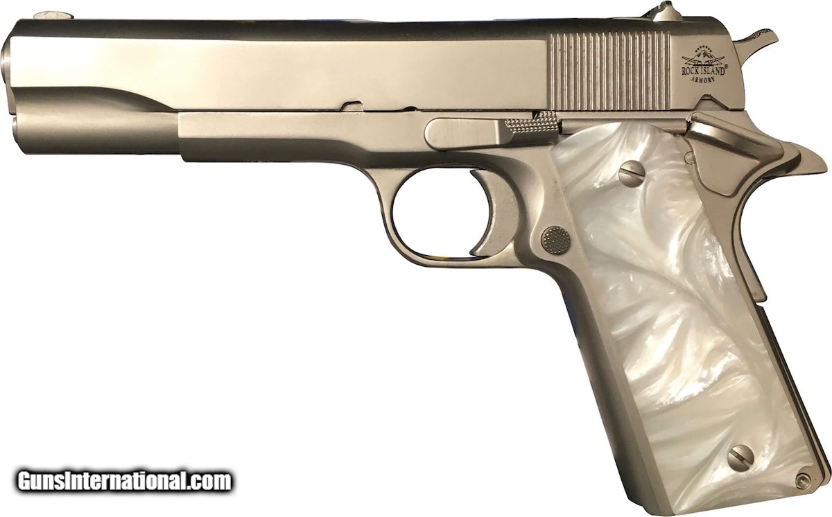 Description: Guns Listing ID: 613376 The M 1911 GI standard is a great representation of the original US GI combat issue 1911 and is chambered in 45 ACP and built with our exacting engineering standards. Fixed, low profile sights and traditional smooth slim design are perfect for quick pull holster use. A bright nickel finish is perfect for those who want a glossy, durable look and feel. Smooth wood grips offer comfort in both feel and design. The 5\" barrel offers a balanced weight to assist with the accuracy and recoil that made the original 1911 design famous. True to all Rock Island 1911s, the GI Standard comes with a crisp factory 4- to 6-pound trigger to make it a great experience right out of the box. SOLD Manufacturer: ROCK ISLAND ARMORY Model: GI STANDARD FS *CA COMPLIANT Caliber Info: .45 ACP Condition: new Barrels: 5 BARREL Finish: NICKEL MATTE |