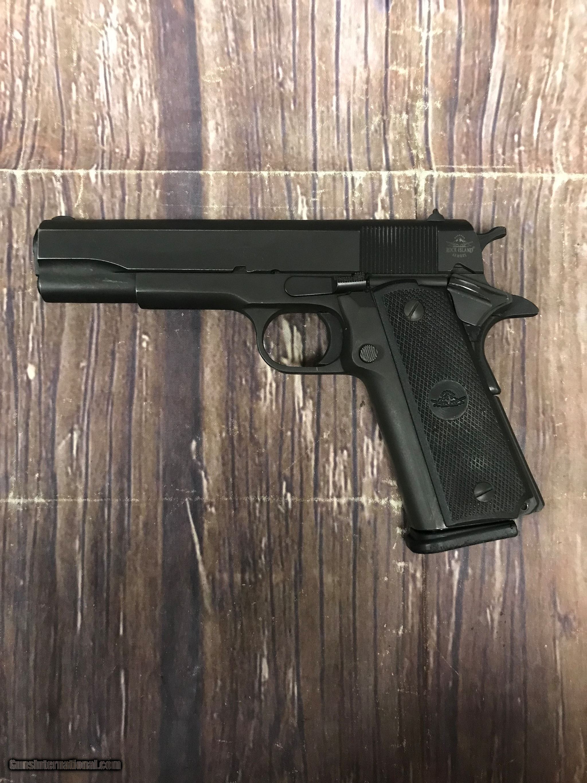 Description: Guns Listing ID: 1087430 According to our rating scale I would Rate this gun \"Good\". I have taken multiple pictures to show the condition of it. We want you to get the best impression of it. With the hopes when you get it, that it is better than what you thought. 100% working order. Some scratches and dings Comes with gun, box and one mag. The bore I would rate 5.5 out of 10. If I had to rate the firearm in condition I would say 6 out of 10.(Please see my pictures for a better detailed idea), Please see all Photos for a very detailed Description of condition. We rate firearms using these condition standards, for modern firearms. NEW-A gun given a grade of \"new\" looks just as it did when it left the factory and has never been sold at a retail store. PERFECT-A “perfect” gun is literally as good as new, although it may have been sold in a retail store. EXCELLENT-An “excellent” rating means the gun appears to be in perfect condition but may have had minor use. VERY GOOD-A “very good” firearm is perfect mechanically but may have minor cosmetic blemishes. GOOD-A rating of “good” indicates that the gun is in proper working condition but may show signs of wear. FAIR-A “fair” firearm may or may not be in safe working order. It has not been test fired, only visually inspected. It may need repair or maintenance. UNRATED-Unrated condition means this firearm has not been test fired, it may function perfectly or it may be in need of repair. Cosmetically it may be in very good to fair condition. You will need to look at the pictures and ask questions SOLD Manufacturer: ROCK ISLAND ARMORY Model: GI STANDARD FSHC CA COMPLIANT Caliber Info: .45 ACP Condition: Used - Non-Certified Barrels: 5 BARREL |