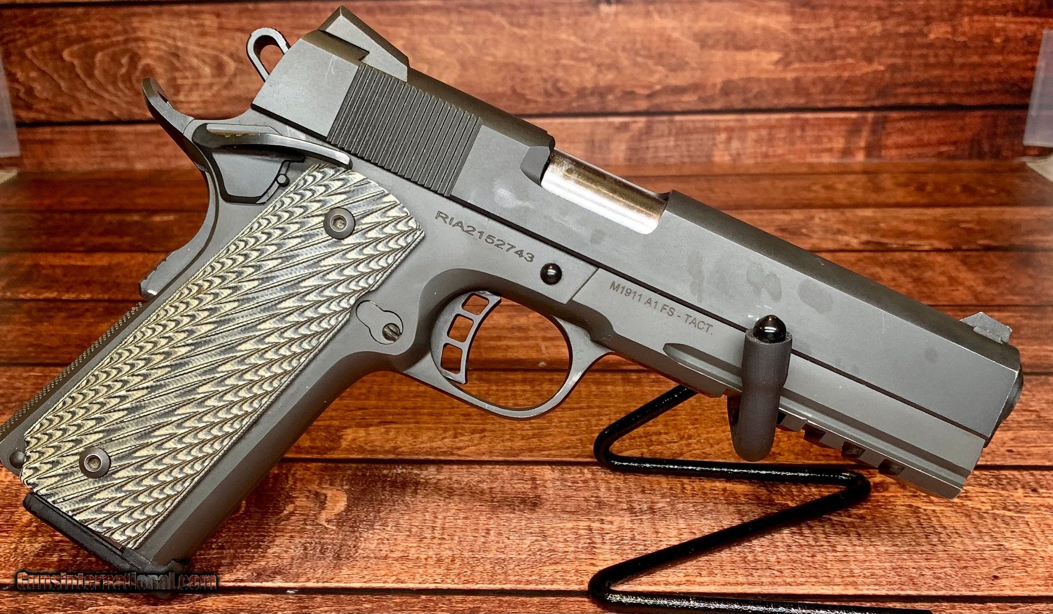Description: Guns Listing ID: 485182 The Rock Island Armory (RIA) M1911A1 FS Tactical is a remarkable piece for any firearm enthusiast or collector, combining the storied history of the original M1911 with contemporary tactical enhancements. This semi-auto pistol, chambered in .45 ACP, is in excellent condition, showing only faint signs of prior use and handling. The bore is pristine, with a clean, mirror finish and sharp rifling, ensuring top-notch performance and accuracy. Included in the sale are one 8-round magazine, providing ample capacity for various shooting scenarios. Firearm also comes with soft pistol case. This modern iteration of the classic M1911, originally designed by John Browning and adopted by the U.S. military in 1911, preserves the historical design and robust performance while integrating modern features. The M1911A1 FS Tactical is finished in a durable black coating and equipped with grey textured G10 grips, offering both style and functionality. The dovetailed front and adjustable rear sights enhance target acquisition and accuracy, making it a reliable choice for both defense and range shooting. Additionally, the ambidextrous safety ensures that both right and left-handed shooters can operate the firearm comfortably and safely. The extended beavertail and combat-style sights further enhance the tactical capabilities of this firearm, making it a versatile addition to any collection. Whether you are a seasoned professional or a dedicated enthusiast, the RIA M1911A1 FS Tactical offers an enticing combination of heritage, reliability, and modern performance. The .45 ACP caliber provides formidable stopping power, while the 8+1 capacity ensures you are well-equipped for any situation. Its sleek appearance and tactical enhancements make it not only a practical choice but also a prized collectible. Specifications Manufacturer Rock Island Armory (RIA) Model M1911A1 FS Tactical Caliber .45 ACP Overall Condition Excellent Bore Condition Excellent Action SAO Capacity 8 + 1 Barrel Length 5\" Finish Black Sight/Optic Dovetailed and adjustable rear. SOLD Manufacturer: ROCK ISLAND ARMORY Model: M 1911 A1 FS Tactical Caliber Info: .45 ACP Condition: Used - Non-Certified Barrels: 5 BARREL Finish: black |