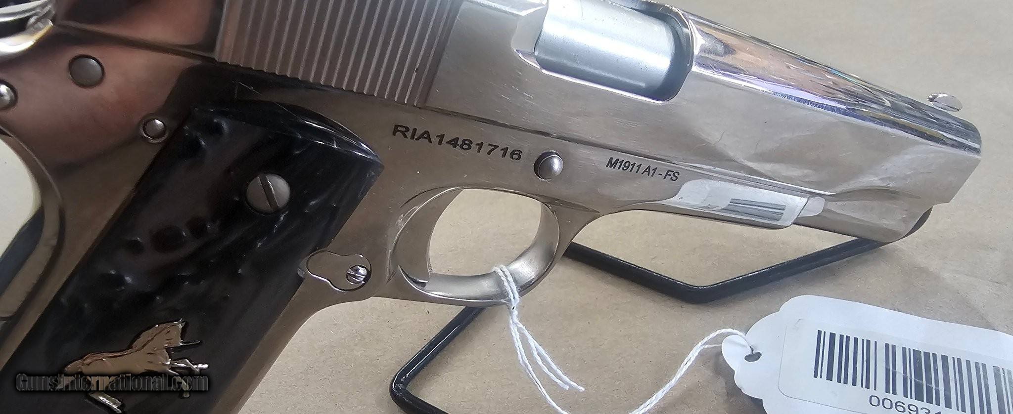 Description: Guns Listing ID: 566219 For Sale – Rock Island Armory M1911 A1-FS (.38 Super, Chrome, Black & Gray Grips) Up for sale is a Rock Island Armory M1911 A1-FS, chambered in .38 Super. The A1-FS is Rock Island’s full-size Government model 1911, built on a solid steel frame and slide with classic styling and reliable performance. Chambered in .38 Super, this pistol offers a powerful, flat-shooting cartridge in a 1911 platform. This example features a chrome finish with upgraded black and gray grips, giving it a distinctive look. Specifications Make / Model: Rock Island Armory M1911 A1-FS Caliber: .38 Super Action: Single-action, semi-automatic (1911 platform) Barrel Length: 5" Overall Length: 8.6" Height: 5.5" Weight: ~39 oz unloaded Frame / Slide: All-steel, chrome finish Sights: Fixed GI-style sights Grips: Custom black and gray grips (aftermarket or upgraded) Magazine Capacity: 9 rounds (confirm included mag) Condition: Very good – light wear, chrome finish clean, action cycles smoothly Highlights Full-size 1911 Government model chambered in .38 Super Chrome finish for durability and standout appearance Upgraded black and gray grips for style and comfort Classic 1911 ergonomics with a crisp single-action trigger Flat-shooting .38 Super cartridge – excellent for range or competition Reliable Rock Island Armory build at an affordable price point ?? Rock Island Armory M1911 A1-FS – .38 Super, chrome finish, with black and gray grips. Full-size 1911, stylish and reliable. SOLD Manufacturer: ROCK ISLAND ARMORY Model: M1911 A1-FS Caliber Info: .38 SUPER Condition: Used - Non-Certified Barrels: 5" BARREL Action: SEMI AUTOMATIC Finish: chrome |