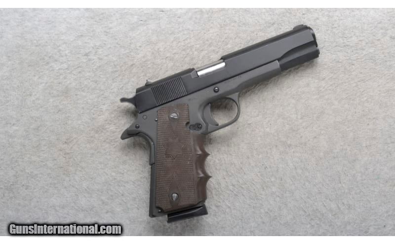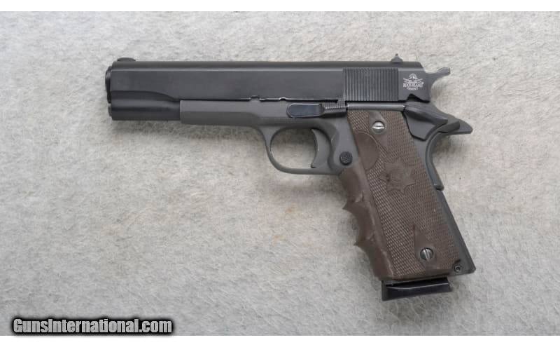 Description: This Rock Island Armory Model M1911 A1-FS is a right hand semi-auto pistol in .45 ACP Cal. It has a 5 inch barrel with a rear serrated slide. A blade front sight and notch rear sight. The grip is a Bianchi diamond checkered brown rubber with finger grooves. .45 ACP SOLD Chambers: 8 round magazine. Metal Condition: Good. Shows a little use. Wood Condition: Good. Bore Condition: Very Good. Barrels: 5 inch barrel with a rear serrated slide. Weight: 42 oz. Sights: Blade front. Notch rear. Item Location: Richfield, WI |