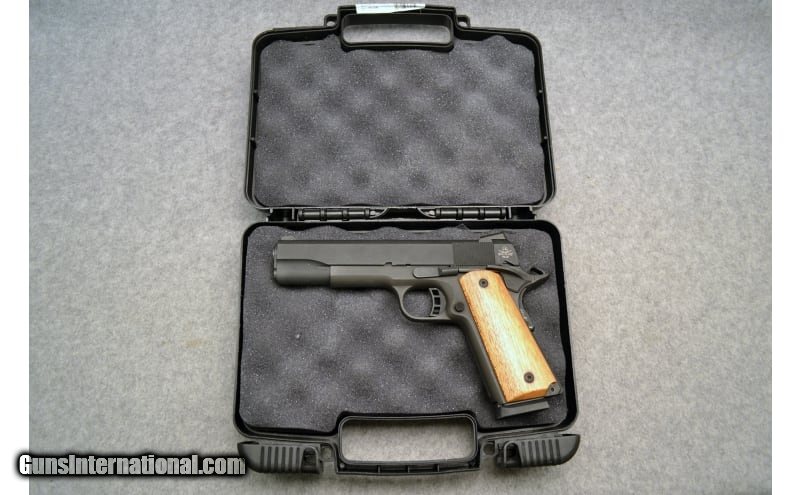 Description: This Rock Island Armory Model M1911 A1-FS is a right hand semi-auto pistol in .45 ACP Cal. It has a 5 inch barrel with a rear serrated slide. A blade front sight and notch rear sight. The grip panels are a smooth hardwood. Includes a hard case and one magazine. .45 ACP SOLD Barrels: 5 Weight: 40 Oz. Item Location: christiana |