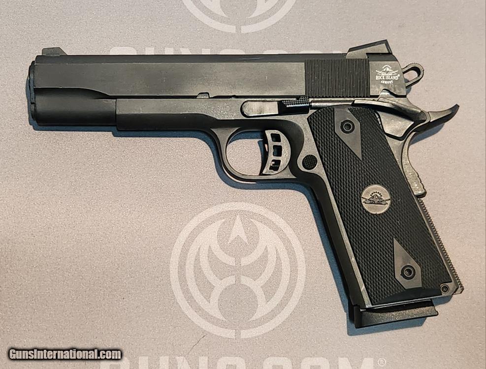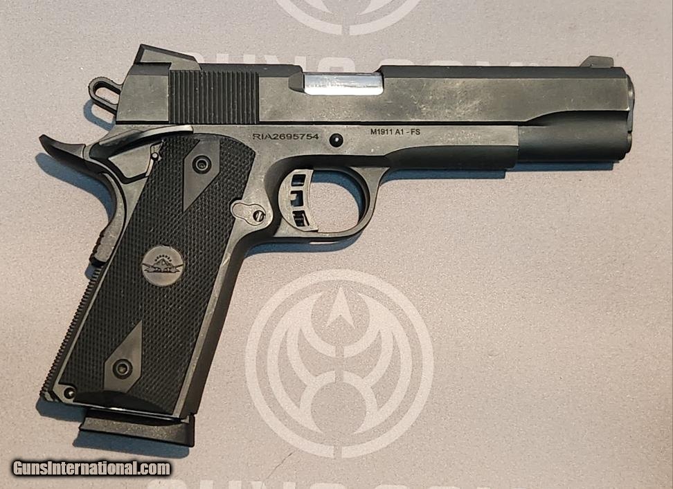 Description: Guns Listing ID: 1388296 Inventory Number: FCS097144 ROCK ISLAND ARMORY 1911 A1-FS, SEMI - AUTOMATIC, 45 ACP (45 AUTO), BLACK (MATTE), NOT INCLUDED, 5\" Barrel Length OPEN TO OFFERS Very Good Condition Handgun Polymer Grips Good Condition Parkerized Finish Specific Details: NRA Modern Gun Condition Rating Standards: VERY GOOD: In perfect working condition, no appreciable wear on working surfaces, no corrosion or pitting, only minor surface dents or scratches. Finish / Color: Black (Matte) Case & Box: No - Not Included Caliber: 45 ACP (45 Auto) Action: Semi - Automatic Magazine: Yes - Includes Original Magazine (s) Holster: No - Not Included SOLD Manufacturer: ROCK ISLAND ARMORY Model: M1911 A1 - FS Caliber Info: .45 ACP Condition: Used - Non-Certified Barrels: 5 BARREL Finish: PARKERIZED |