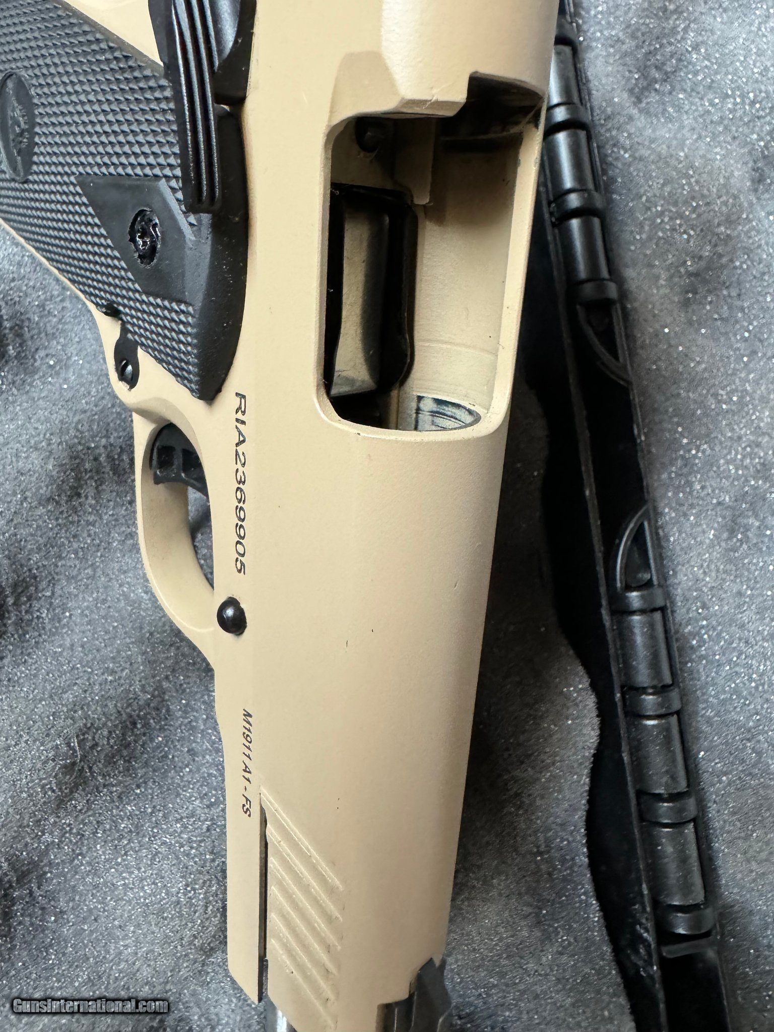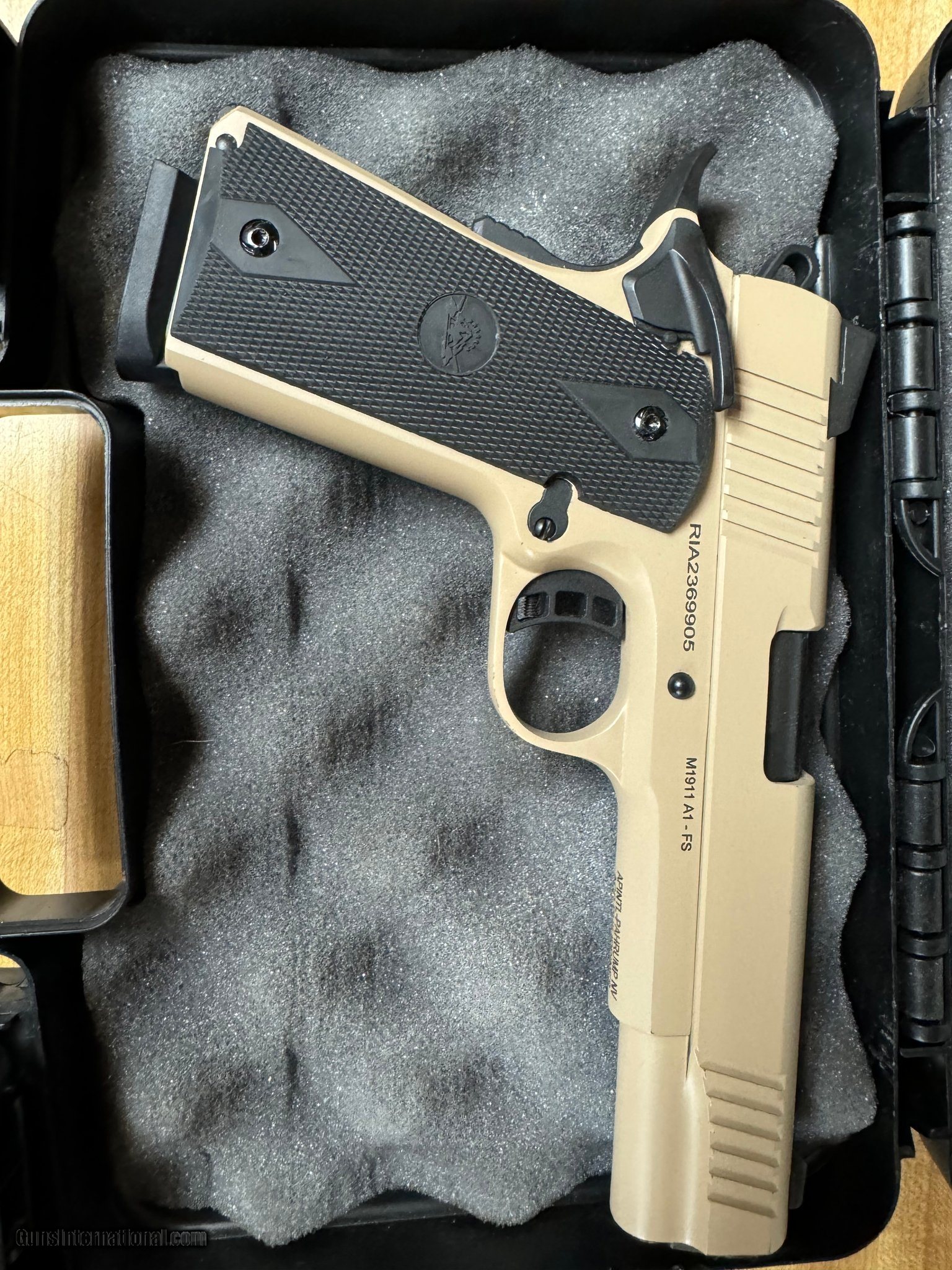 Description: Guns Listing ID: 476153 Rock Island armory version of a 1911. Chambered in 45 ACP, 5” barrel length, black grips, guard for your firstspace. Had 5 total magazines. 5 are 8 round magazines and the 5th looks like it holds 10 rounds. Comes with case SOLD Manufacturer: ROCK ISLAND ARMORY Model: M1911 A1-FS Condition: Used - Non-Certified Barrels: 5 Gauge Info: .45 ACP Finish: black and tan |