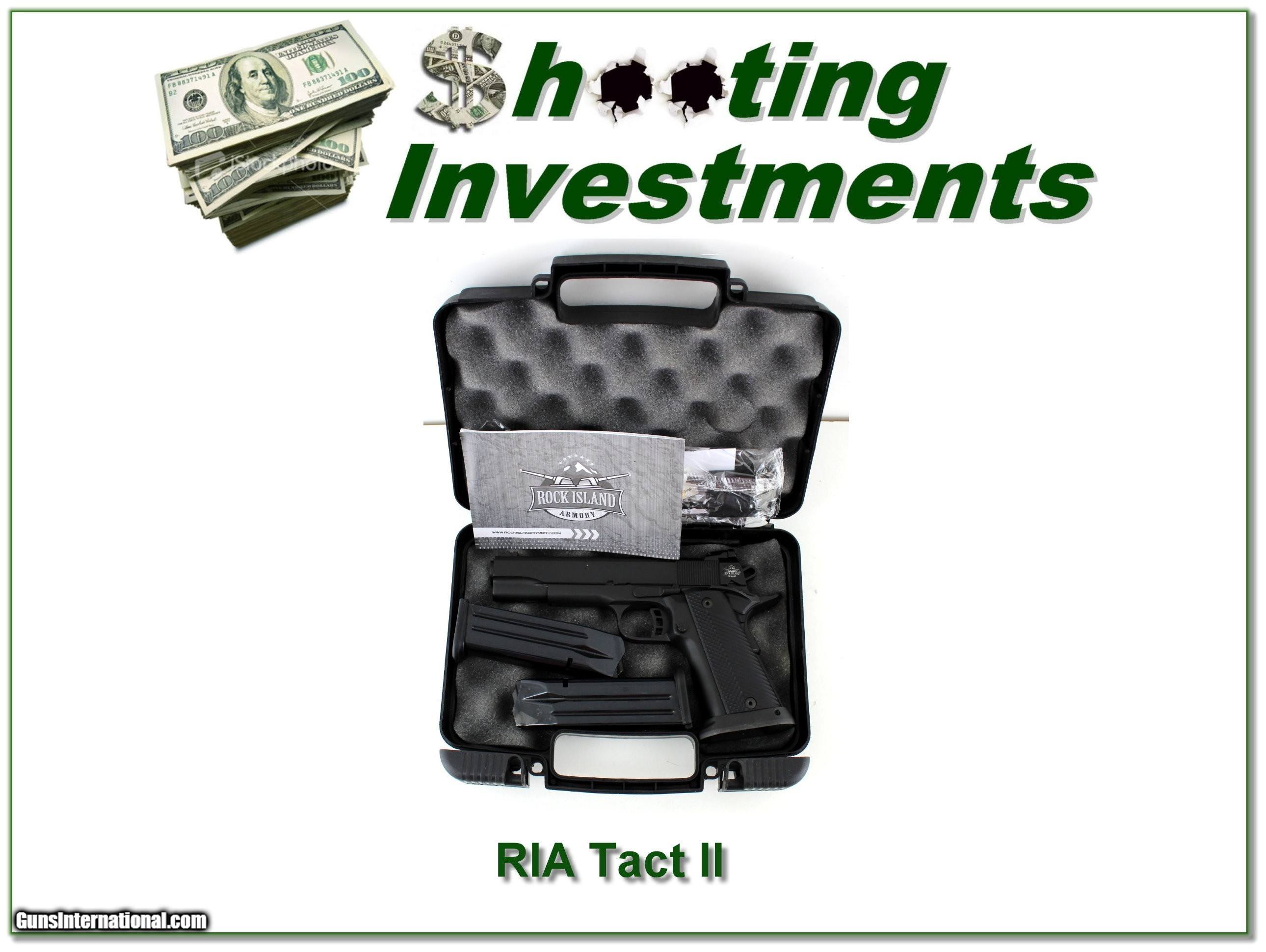 Description: This is a hard to find RIA mid-sized 1911 Tact II in 10mm. It is excellent with light use and comes with 2 magazines and in cast with papers. I am selling this one on consignment and as such lay-a-way can’t be used. It does of course have the standard 3-day inspection. Shipping and insurance is $39. Please email me with any questions or larger pictures. (Consign your quality firearms with Shooting Investments for only 12%! Let me know if you have any you would like to sell!) 23-0632 Payment: Payment is by Money Order, Cashier’s Check or Personal Check. I can now also accept Credit Cards (MasterCard, Visa, Discover & American Express) with a 3% convenience fee. Shipping: The shipping charge will be listed in each description. It is $49 for most firearms. Some heavy guns or those insured for over $2000 will be higher. Shipments to Alaska and Hawaii are higher because air shipment is required. Most firearms are shipped on Tuesday and Thursday and usually in 5 days of receipt of payment. We package all shipments carefully and insure them. Optics are shipped Priority Mail and most other non-firearm shipments are shipped First Class. Returns: Our return policy is simple. If for any reason you are not pleased with your purchase, you may return your item for a full refund of purchase price. Ammunition cannot be returned. It is important to us that you are happy. Guns cannot be fired or dissembled before returning them and they must be returned in the same condition as received. Notification of a return must occur within 3 days of receipt at your dealer. Shipping, convenience and dealer fees are not refundable and are the responsibility of the buyer. Lay-a-way: If needed, we offer a 60 day lay-a-way option on most firearms. It is 1/3 now, 1/3 in 30 days and 1/3 in 60 days. Lay-a-way firearm sales are final and cannot be returned. If a lay-a-way is not completed the first payment cannot be refunded. Consigning your firearms with Shooting Investments: We will help you get top dollar for your firearms. While most local guns shops charge 20% or more, our fee is only 12% with a minimum of $75. At your local gun shop it might take months to sell. Selling on-line provides instant access to thousands of interested buyers. You won’t find any other on-line dealer willing to sell your firearms for only 12% or listing every gun on 3 separate s. Selling through an House typically costs the seller 15% and the buyer an addition 15% (so 30%) and you have to wait several months to sell and longer to receive funds. If properly priced, we will sell your firearms within a few weeks. Send us an email or give us a call and we’ll explain how easy it is for you to get top dollar. Trading: Trading for us is really just buying your gun to re-sell. If you have a gun you want to trade, please email a picture and we will let you know what we can give for it. You will always get more if we sell it for you on consignment. SOLD |