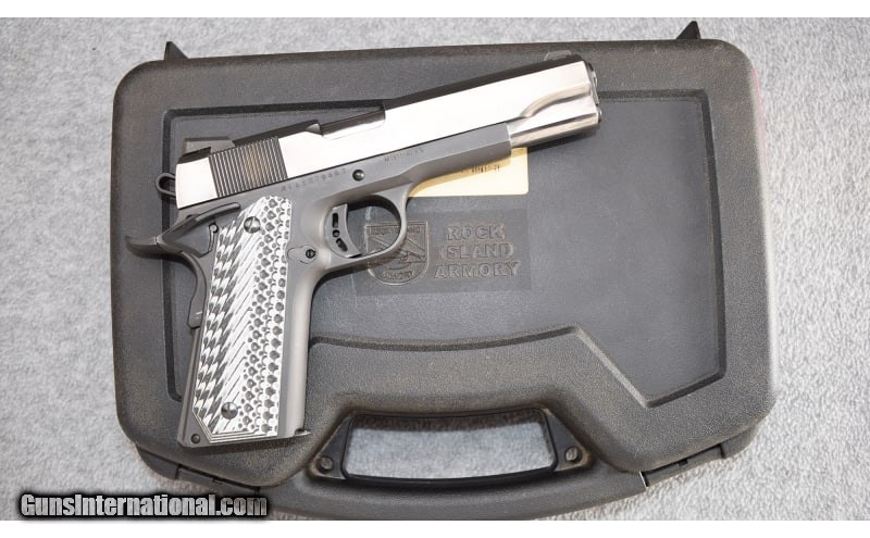Description: This Rock Island Arms Model M1911 remains in excellent overall condition showing only light use. Blade Front sight has been painted white. Complete with original black plastic case, manual, and extra (2 Total) 8 round magazines. 9mm Luger SOLD Metal Condition: Excellent Bore Condition: Excellent Barrels: 5 Triggers: Factory Butt Pad: Black & White G10 Grips Weight: 44 oz. Sights: White Blade Front - Fixed Square Notch Rear Item Location: Wheeling |
