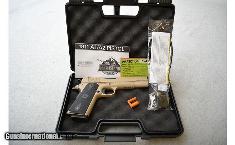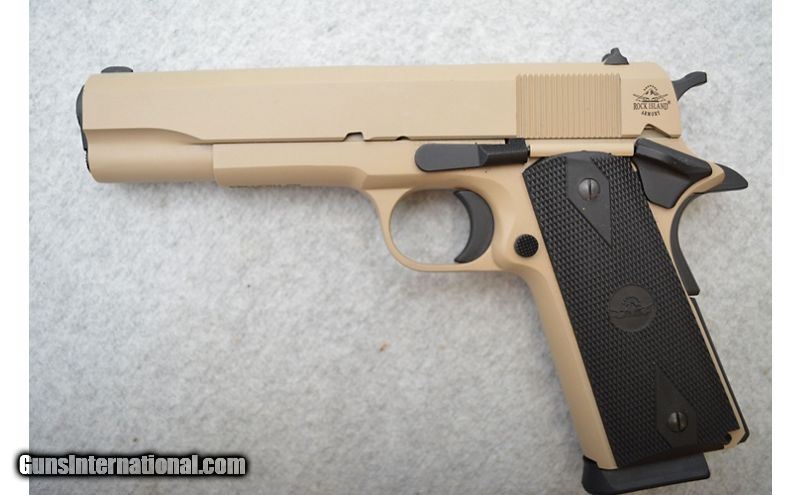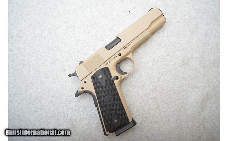 Description: Good overall but a few disappointments. While generally good, the metal has some patches of corrosion around the muzzle and around the rear sight. As shown in the pictures the rear sight has split at the notch and has been bent to the side. Furniture has a few marks to it. Notably around the comb near the butt plate on the left side. The line on the right side of the butt stock is/was a scratch and not a crack. .45 ACP SOLD Chambers: Semiautomatic fed from detachable magazines. Metal Condition: Very good. Wood Condition: Grips are in excellent condition. Bore Condition: Excellent. Barrels: 5" Blued. Triggers: Matte black metal with grooved surface. Stock Dimensions: N/A Fore End: N/A Butt Pad: Black rubber grip panels with the Rock Island logo. Weight: 2lbs 8oz Sights: Fixed GI style front blade and notch rear. Chokes: N/A Item Location: Green Bay |