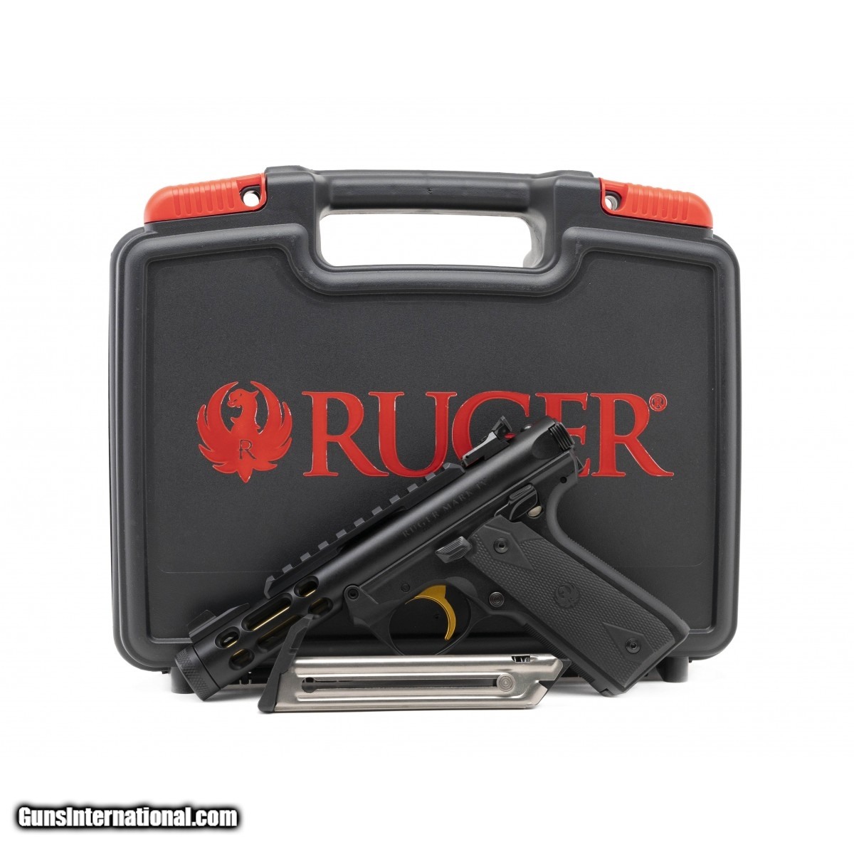 light weight target pistol with 4.4"" gold threaded barrel, polymer frame with 1911 grip angle, one button takedown, adjustable rear sight with optic rail. comes with2-10rd magazines. NEW. UPC: 736676439270