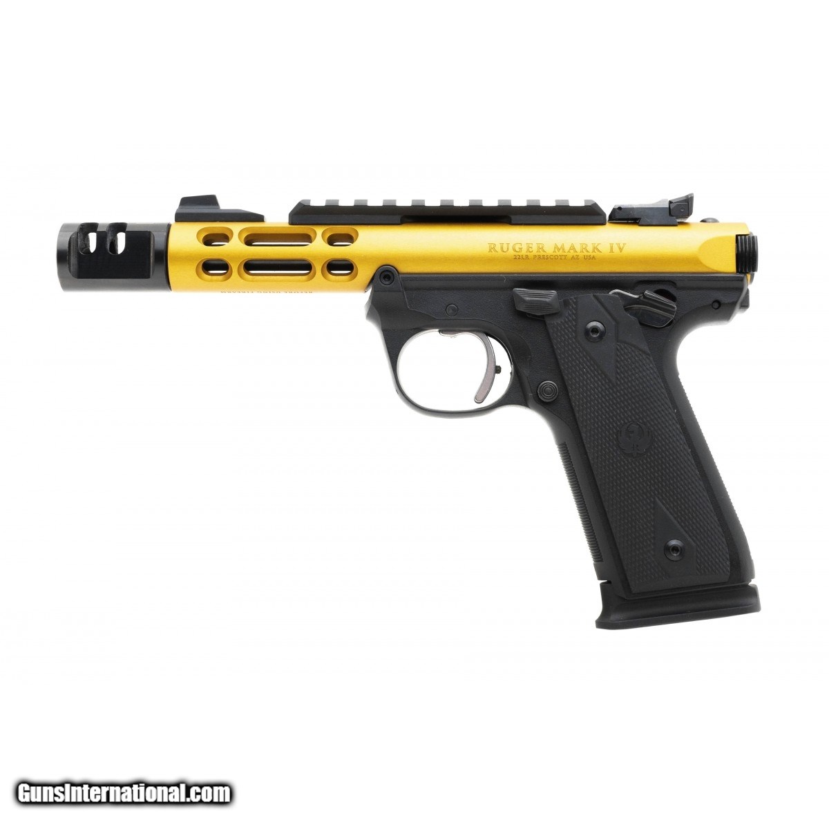 Description: " Mark IV 22/45 Lite 22 LR 4.40"" 10+1 Black Gold Anodized Aluminum Ported Slide Black Polymer Grip. With added compensator and original box. Excellent condition. SOLD |
