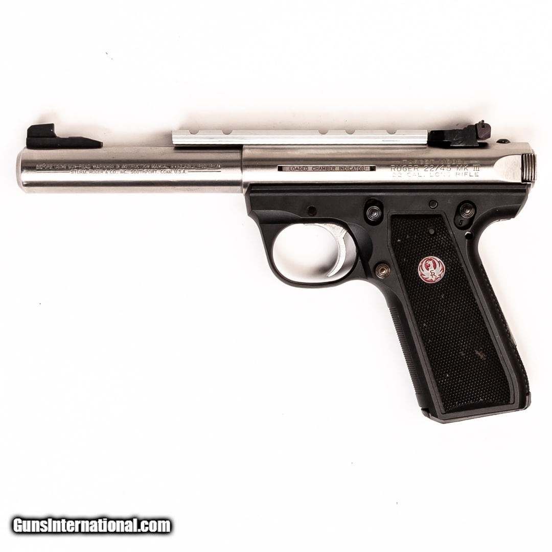 Description: Guns Listing ID: 497499 The Ruger 22/45 Mark III is a merger between two iconic firearms, the Ruger Mark III and the 1911. Functionally this pistol is a traditional Ruger .22 pistol but the controls and ergonomics are that of a 1911. Making this an excellent plinker and target pistol that fits like a glove in your hand. This is a Mark III Target model with a two-tone finish. 4-10 round magazines, the original case, manual, high ride 22/45 holster, and lock out keys are included SOLD Manufacturer: RUGER Model: 22/45 MARK III TARGET MODEL Caliber Info: .22 LR Condition: Used - Certified Barrels: 5.5 BARREL Finish: STAINLESS |