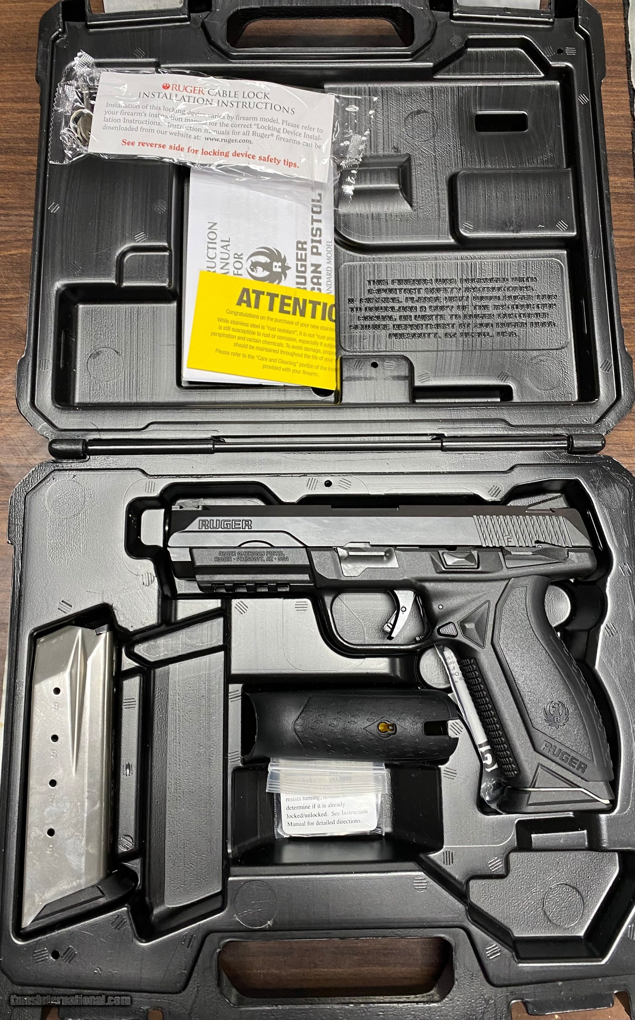 Description: Guns Listing ID: 404 With a design based on feedback from law enforcement military trainers firearms experts and retailers the Ruger American is a full-sized semi-automatic striker-fired handgun featuring a revolutionary platform along with a recoil-reducing barrel cam low mass slide low center of gravity and a low bore axis. Available in both 9mm and 45 ACP the chassis and slide are machined from black-nitride stainless steel and include functional slide serrations and purpose-oriented grip frame texturing for better control. Safety features include an internal automatic sear block system and integrated trigger safety. An inspection port provides visual confirmation of a loaded or empty chamber while the tool-free disassembly and reassembly make for easy maintenance of the American. Details Caliber 45 ACP - Capacity 101 - Slide Material Stainless Steel - Barrel Length 4.50 - Grip Frame One-Piece High-Performance Glass-Filled Nylon - Grips Ergonomic Wrap-Around Grip Module - Slide Finish Black Nitride - Width 1.40 - Sights Novak LoMount Carry 3-Dot - Weight 31.5 oz. - Overall Length 8 - Height 5.70 - Grooves 6 - Twist 116 RH - Trigger features a short takeup with positive reset. - Recoil-reducing barrel cam low-mass slide low center of gravity and low bore axis. - Performance tested for sustained P ammunition use. - Genuine Novak LoMount Carry three-dot sights - Modular wrap-around grip system for adjusting palm swell and trigger reach. - Safe easy takedown with no tools or trigger pull required. - Ambidextrous slide stop and magazine release allow actuation with either hand. - Safety features include internal automatic sear block system integrated trigger safety and no trigger pull required for takedown. - Also includes Two nickel-Teflon plated steel magazines medium and large grip modules SOLD Manufacturer: RUGER Model: AMERICAN DUTY Caliber Info: .45 ACP Condition: new Barrels: 4.5" barrel Finish: SILVER |