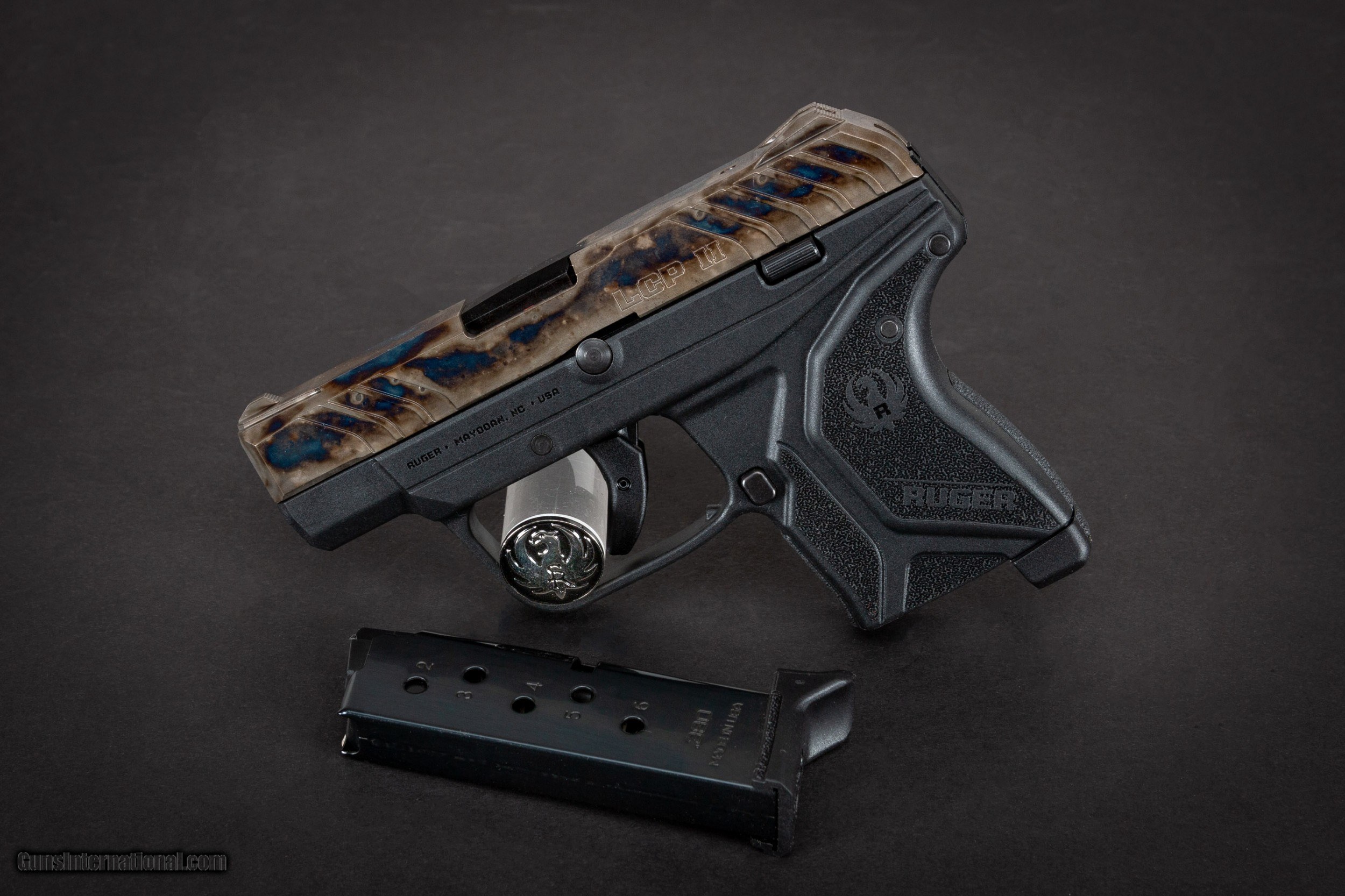 Description: This is a factory-new Ruger LCP II in .380 Auto, featuring bone charcoal color case hardening by Turnbull Restoration.