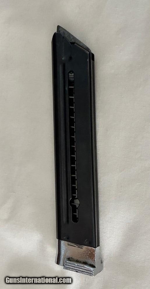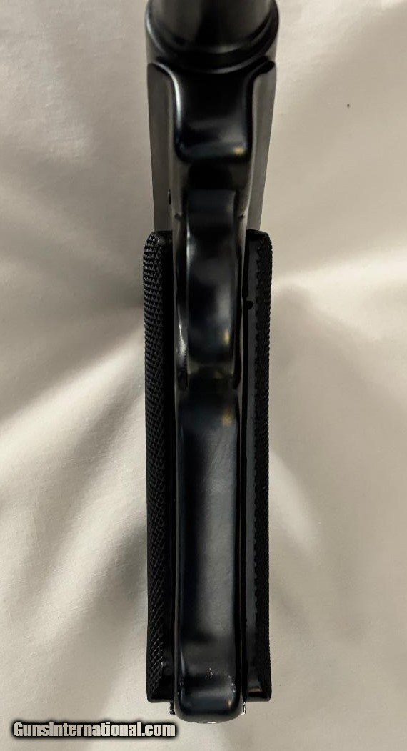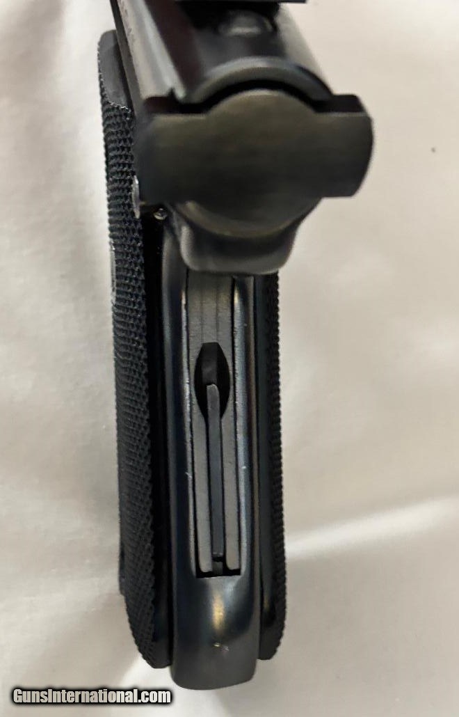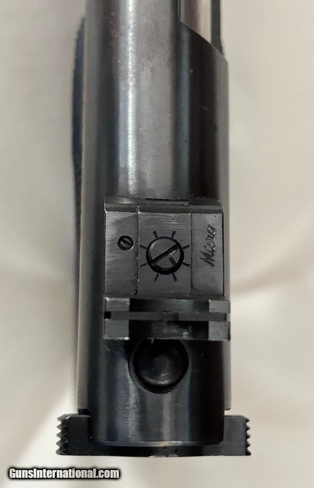 Description: Rare item made in 1956 with solid bolt (not 2 piece with "D" shape joining at rear) having non-tapered cocking ears. When is the last time you saw one for sale? True collector grade with excellent bore, grips (correct hard rubber with black eagle) and 9 round magazine (proper chrome base with slots on both sides). Correct steel Micro brand rear sight and Patridge front blade rather than hooked target sight on the 6-7/8" models. Shipping will be $25 by Priority Mail from my FFL to yours with full value of insurance and tracking. Curio/Relic: Yes Handgun Caliber: .22 Long Rifle Manufacturer: Ruger Model: Mark I, T-514 Serial Number: 75118 Barrel Length: 5-1/4 Chambers: near excellent Condition: near excellent Metal Condition: near excellent Bore Condition: near excellent Action: Semi-Auto Finish: Blued Sights: Micro adjustable Manufacture Date: 1956 Grips: Checkered hard rubber Price: $750.00 Contact Seller |