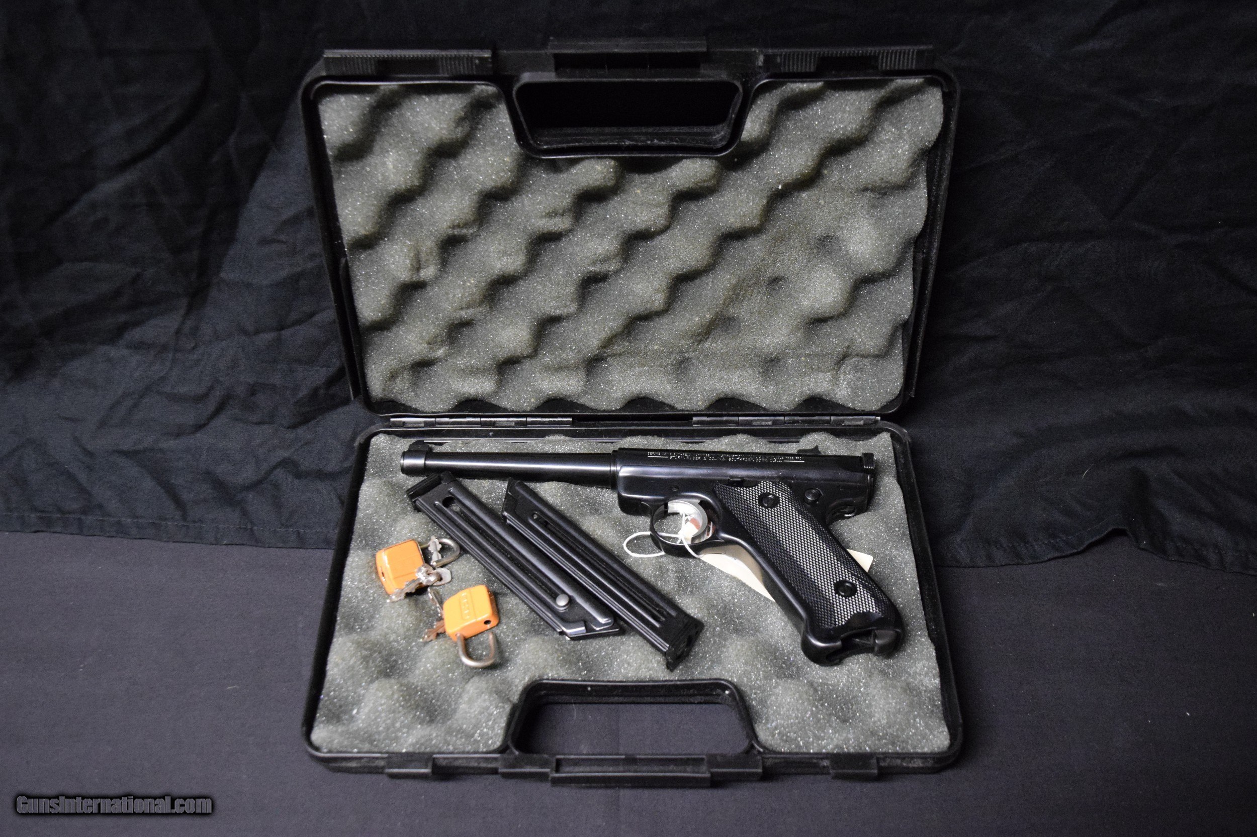 Description: This Standard Mark II is equipped with a 6” barrel, adjustable rear sights, plastic grip, and a blued finish. This package comes with 2 magazines, 2 locks, and the original hard case. The overall condition is great with markings on the frame and grip. Pre-Owned - Ruger Mark II Semi-Auto .22 LR 6" Handgun