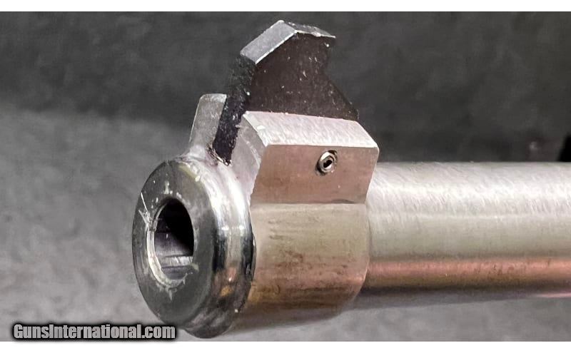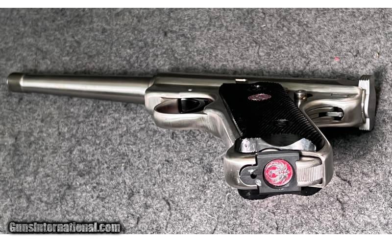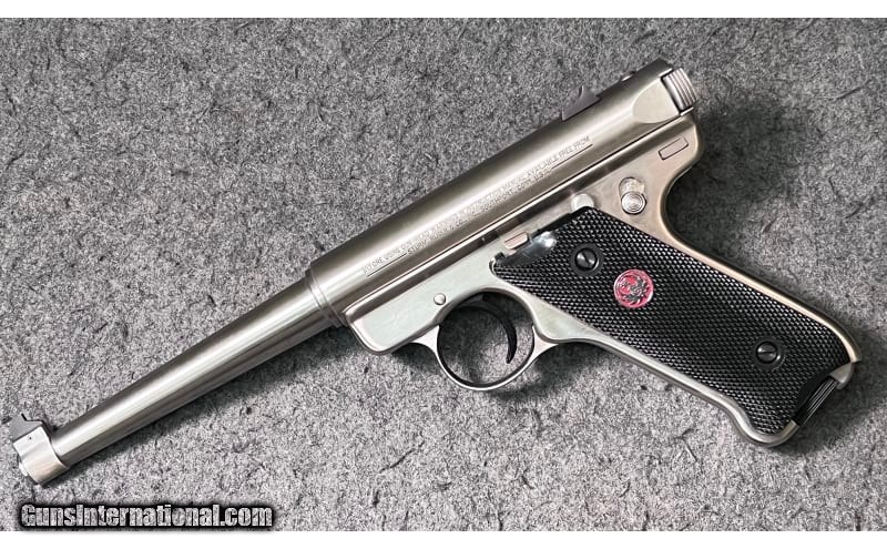Description: This right hand semi-automatic pistol is a Ruger M.K. II chambered in .22 Long Rifle. It has a pinned black blade fixed front sight, a square notch rear sight, a black curved serrated trigger, and a 6-inch barrel. The stainless steel finish is in very good condition, showing very minimal signs of handling wear. The red and silver Ruger emblem grips are in very good condition, showing no handling wear and with no chips, scratches, or cracks visible. It comes with a single 10-round Red Ruger emblem magazine. Known originally as the Ruger Standard, its origins began in Bill Ruger's garage. Bill wanted to design and market a new type of pistol, and in 1945 acquired a captured Nambu pistol from a returning marine. He kept the Nambu's basic silhouette and bolt design and built a rimfire pistol around it. Unlike the vast majority of semiautomatic handguns, the Nambu, and hence the Standard, MK I, MK II, and all subsequent iterations, lacked a slide. Instead, it incorporates a bolt inside a tubular receiver and utilizes a standard blow-back action. This is a lot more reminiscent of semiautomatic rifles than it is of the majority of pistols. It is, however, a very rugged and reliable design. .22 Long Rifle SOLD Metal Condition: "Stainless steel finish is in very good condition, showing very minimal signs of handling wear Wood Condition: "Red and silver Ruger emblem grips are in very good condition, showing no handling wear and with no chips, scratches, or cracks visible Bore Condition: Bore is very bright and shiny with rifling intact Barrels: 6-inch round stainless steel barrel Triggers: Black curved serrated trigger Stock Dimensions: 10¼ inches overall length Weight: 2 lb 3 oz Sights: "Pinned black blade fixed front sight, square notch rear sight Item Location: Wichita, KS |