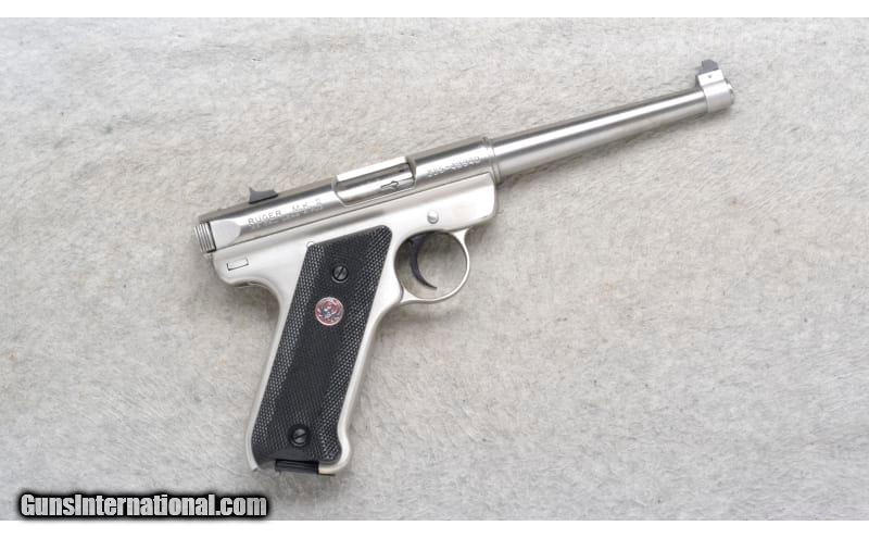 Description: This Ruger Model M.K. II is a stainless steel right hand semi-auto pistol in .22 Long Rifle Cal. It has a 6 inch barrel. A raised blade front sight and a notch rear sight. The grip panels are a checkered black hard plastic with the Ruger eagle medallions. .22 Long Rifle SOLD Chambers: "10 round magazine, Metal Condition: Very Good. Bore Condition: Excellent. Barrels: 6 inch. Weight: 36 oz. Sights: Raised blade front. Notch rear. Item Location: Richfield, WI |