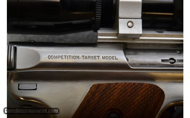 Description: Very good condition overall. Minor handling marks and a tiny speck of inactive surface rust on the left barrel flat about a quarter inch from the edge of the muzzle. Grips are in great shape. Bore is great with healthy shine and good lands/grooves. SOLD Caliber Info: .22 Long Rifle Chambers: Semi-automatic fed from detachable magazines. Metal Condition: Very good. Wood Condition: Grips are in very good condition. Bore Condition: Excellent. Barrels: 7" Slab sided target. Triggers: Wide blued metal with grooved surface. Stock: Laminated wood grips with thumb rest. Weight: 3lbs 6oz Sights: Leupold M8 2x pistol scope. Extras: A total of 2 magazines are included. The original iron sights are absent. Item Location: Green Bay, WI |