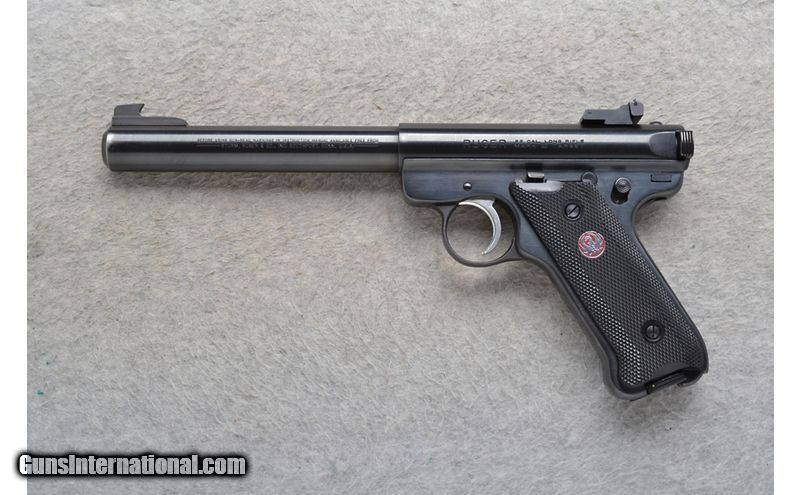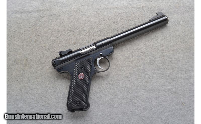 Description: This Ruger Model Mark II Target Government Model is a right hand semi-auto pistol in .22 LR Cal. It has a 6.75 inch heavy target barrel and a rear charging bolt grip. A raised blade front sight and an adjustable notch rear sight. The grip is a checkered hard black plastic with the Ruger eagle logo. It has a grooved trigger .22 Long Rifle SOLD Chambers: Semi-Auto 10 round magazine. Metal Condition: Excellent. Blue wear at the bore. A couple of very minor handling marks. Bore Condition: Excellent. Barrels: 6.75 inch heavy target barrel. Triggers: Grooved. Weight: 46 oz. Sights: Raised blade front. Adjustable notch rear. Item Location: Richfield, WI |