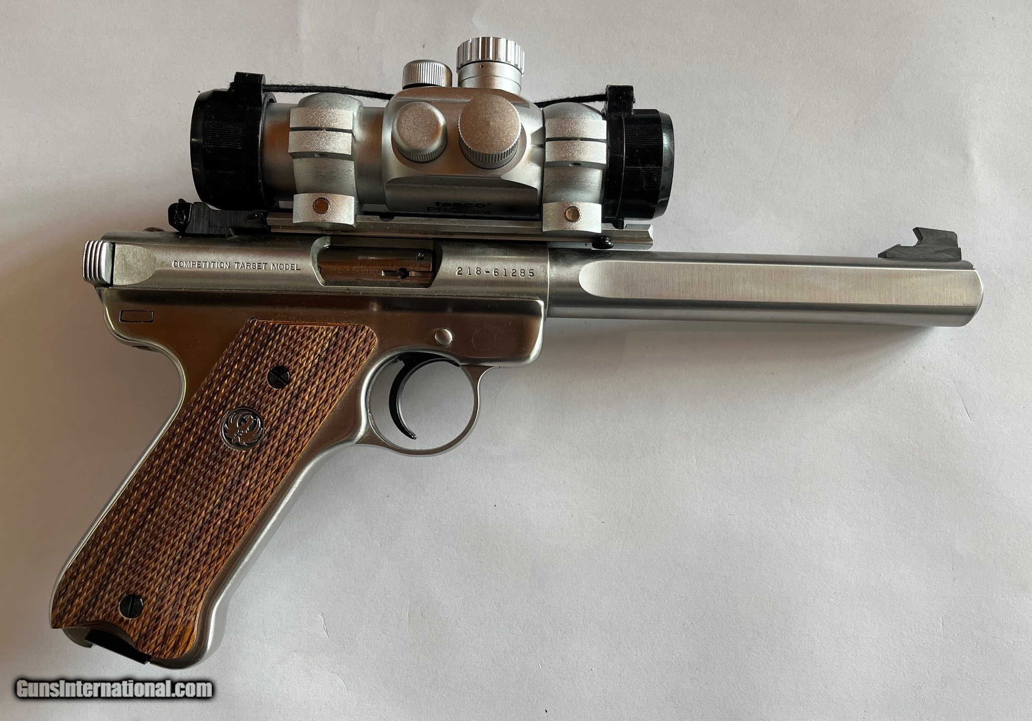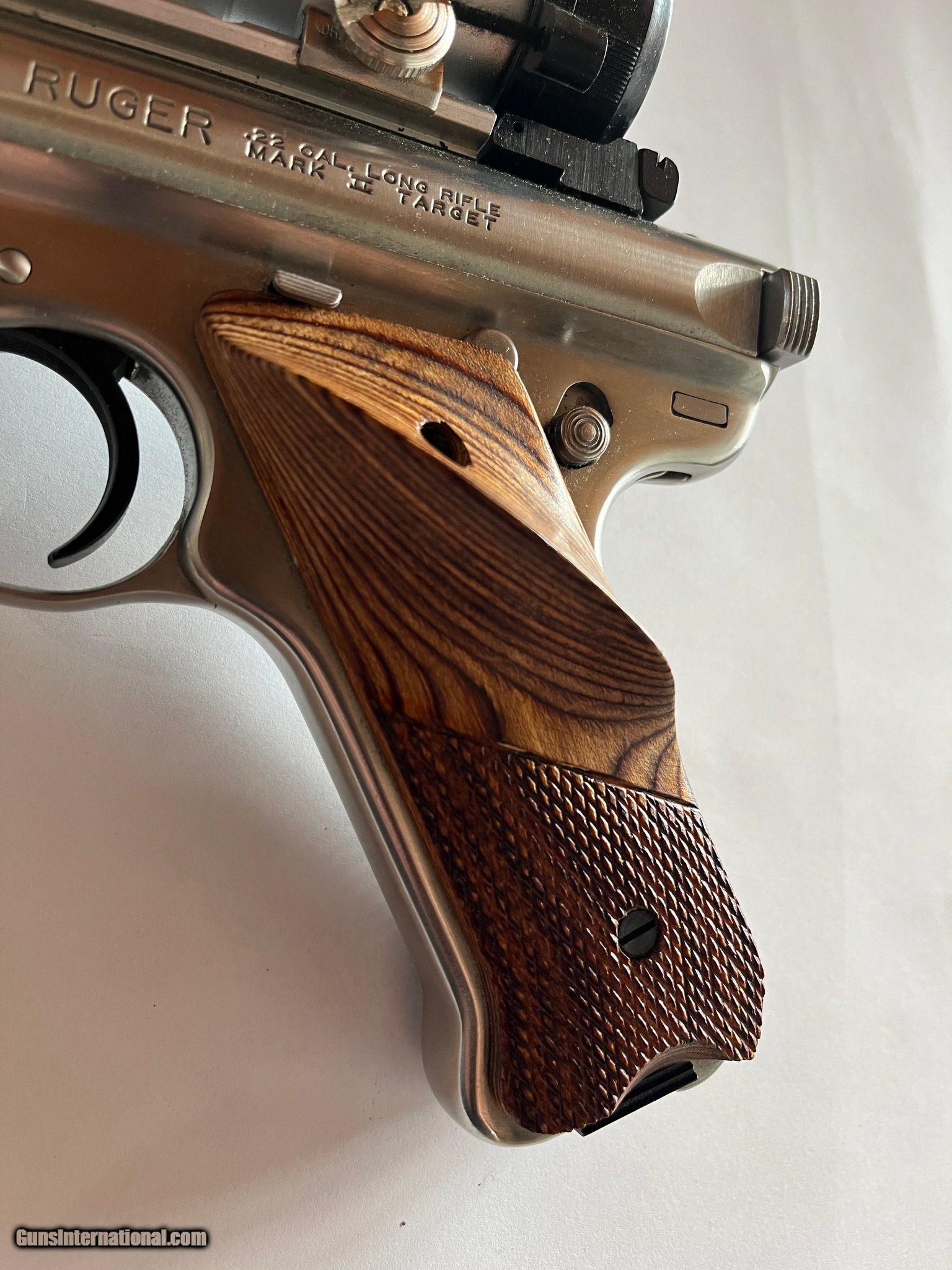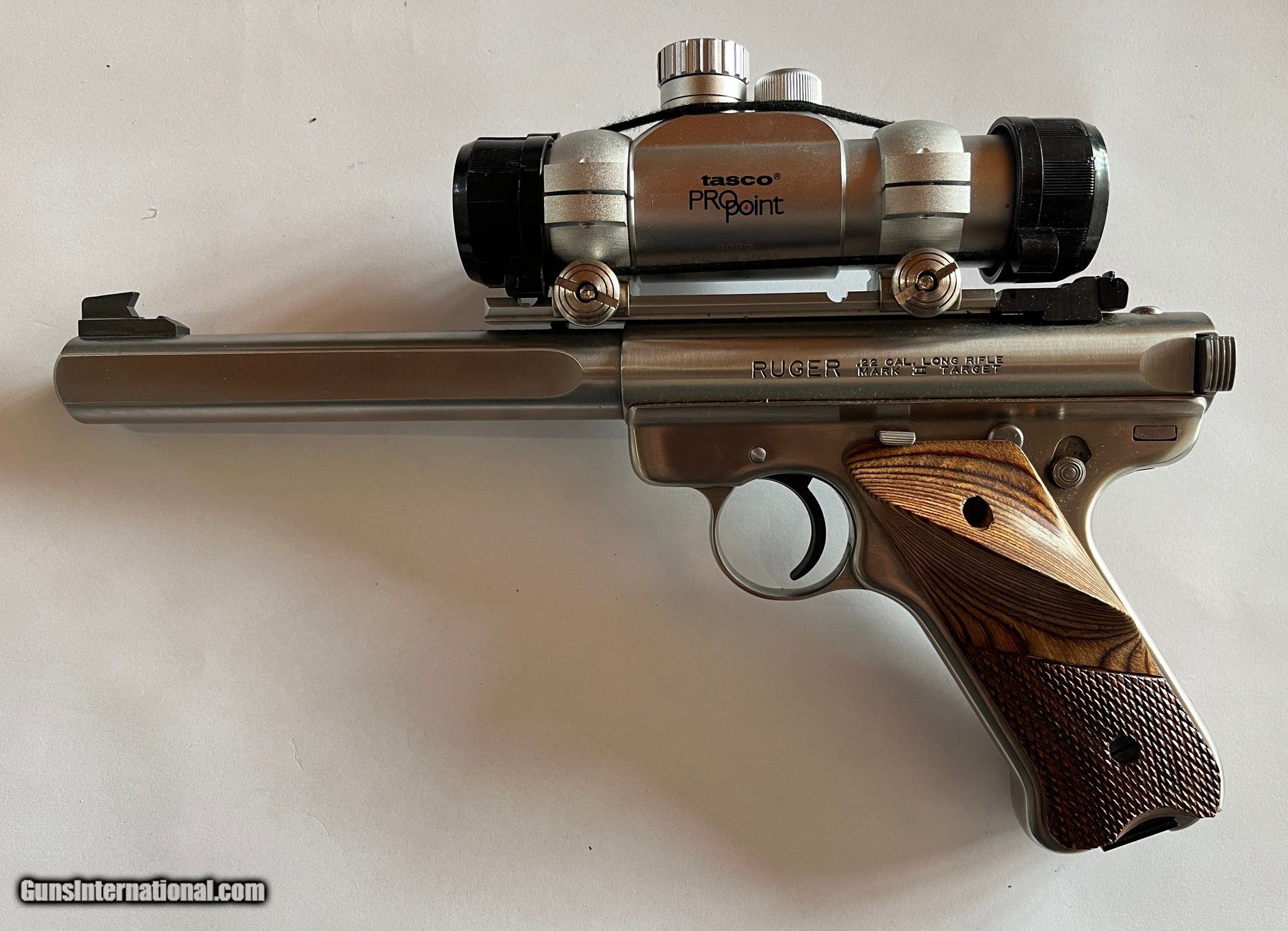 Description: Guns Listing ID: 1356867 Mint & Rare .22LR 10 shot Stainless 6 7/8\" Ruger Slab Side Bull Barrel. Ruger rail mount and with Tasco Pro Point red dot. Quick removable for iron sight use. Very nice wooden target grips. These were made by Ruger factory in the early 1990‚‚s and very rare! Includes 2-10 Round Factory Mags and extra set of factory Ruger rings. Factory box is not available. Firearm will ship in a soft sided pistol case SOLD Manufacturer: RUGER Model: Mark II Slab Side Caliber Info: .22 LR Condition: Used - Non-Certified Barrels: 6.75 BARREL Finish: STAINLESS |