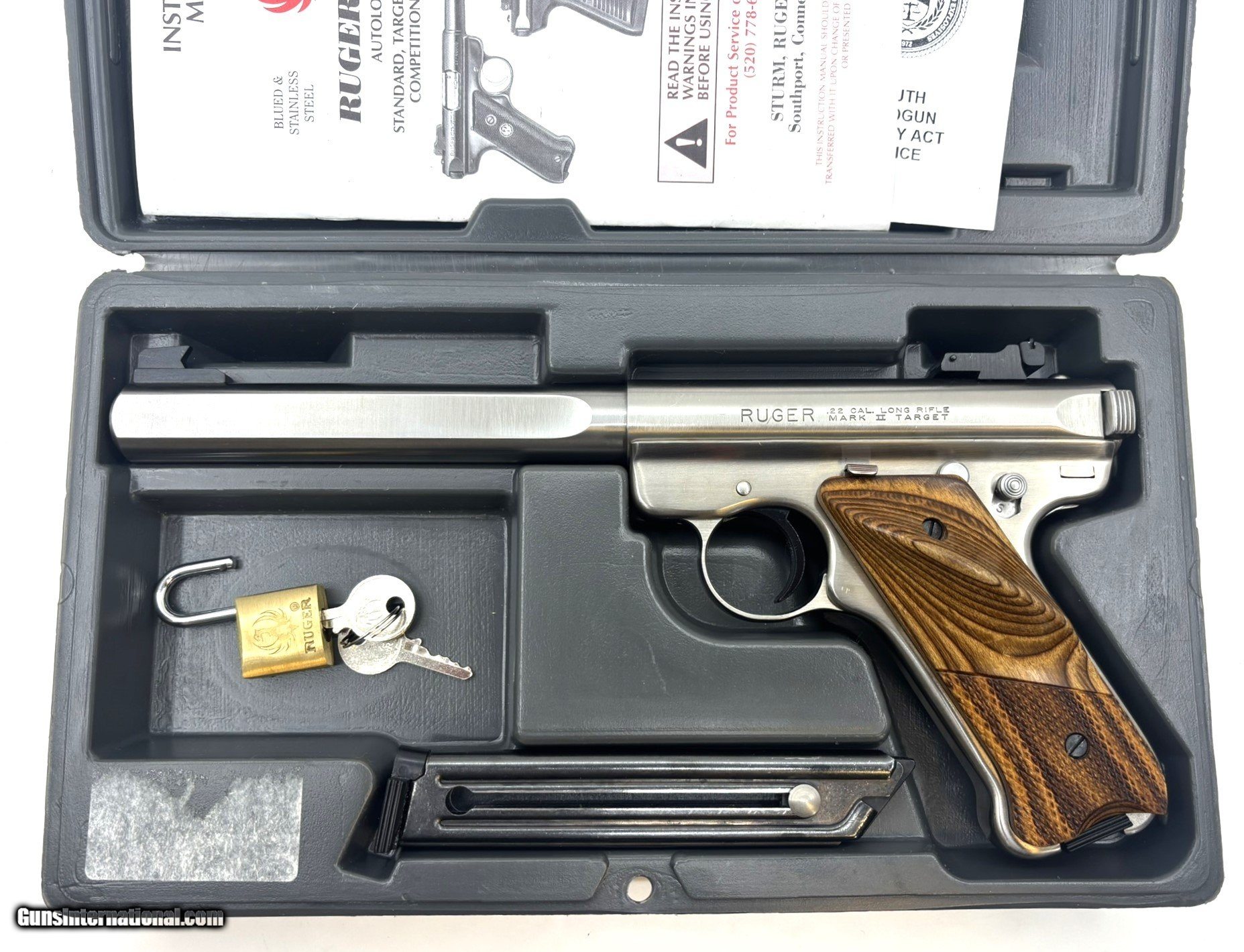 Description: Guns Listing ID: 504831 This Ruger Mark II Stainless Steel Slab Side Competition Target Model .22LR pistol is in excellent condition with only a few minor imperfections. This precision target pistol features the very desirable 6 7/8\" heavy slab-sided barrel. The pistol is equipped with right-handed wood target grips with thumb rest that are also in exceptional condition. There are minor surface scratches that can be seen in the photos. There is also a scratch on the frame just below the bottom of the main spring housing on the backstrap. Mechanically, this Mark II functions as expected. It has a crisp trigger and the bolt operates smoothly and doesn‚‚t feel gritty or worn. The adjustable target sights are in great condition and the spring in the rear sight is present and functional. The bore is clean and bright with well-defined rifling. This all-stainless steel Ruger Mark II Slab Side comes with the original Ruger hard case, two Ruger silver emblem magazines, the original small Ruger padlock and the original owner’s manual. The serial number dates this Ruger as being manufactured in 2002. It’s condition shows that it has been extremely well cared for since then. SOLD Manufacturer: RUGER Model: MArk II Slab Side Competition Target Model Caliber Info: .22 LR Condition: Used - Non-Certified Barrels: 7 Action: SEMI AUTOMATIC Finish: stainless steel |