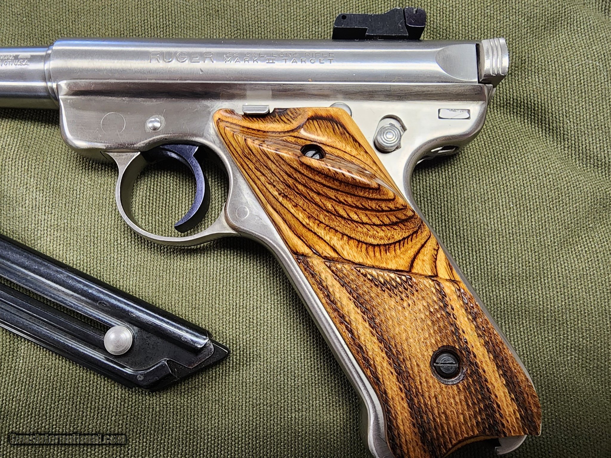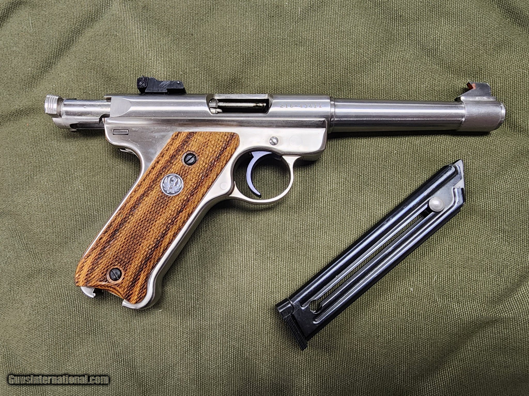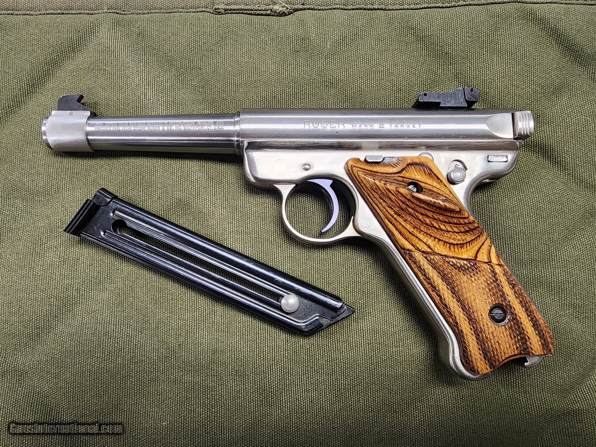 Description: Guns Listing ID: 569610 The Ruger Mark II Target .22LR with its 5.25\" barrel is a perfect blend of accuracy, reliability, and classic Ruger design. Built for precision shooting, the extended target barrel offers excellent balance and a longer sight radius, making it ideal for range use or target competition. This pistol is in very good condition, showing light handling wear but no mechanical issues. The laminated wood target grips provide a secure, comfortable hold while adding a touch of style to the pistol’s overall look. With its 10+1 capacity and Ruger’s legendary rimfire reliability, this Mark II is both a shooter’s favorite and a collectible classic. ? Caliber: .22LR ? Capacity: 10+1 ? Barrel Length: 5.25\" Target Barrel ? Condition: Very Good – well cared for, fully functional A timeless rimfire that’s equally at home on the range or in a collection. SOLD Manufacturer: RUGER Model: MARK II TARGET Caliber Info: .22 CAL Condition: Used - Non-Certified Barrels: 5.25" BARREL Action: SEMI AUTOMATIC Finish: BRUSHED STAINLESS |