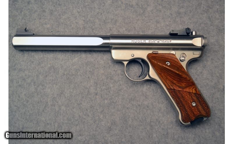 Description: Ruger® Mark II™ Target Semi-Auto Stainless Steel pistol. Features a 7" stainless steel bull barrel, a partridge-style, target front sight, and fully adjustable target rear sight. The receiver is drilled and tapped for attaching a Picatinny-style rail. The Ruger Mark II Target is a great semi-auto rimfire pistol for target practice, formal shooting competitions, or hunting. Comes with two 10-round magazines, a hard case, and mounting rings. .22 Long Rifle SOLD Barrels: 7 Weight: 3 lb Item Location: christiana |