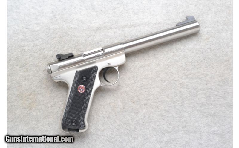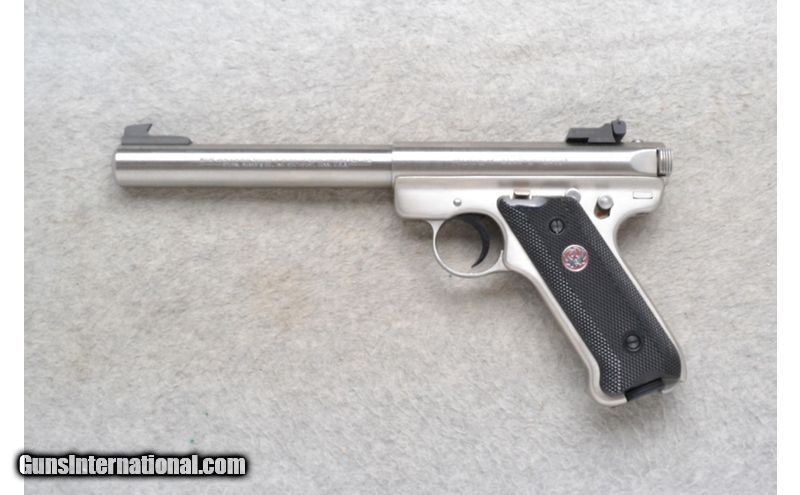 Description: This Ruger Model Mark II Target is a right hand semi-auto pistol in .22 Long Rifle Cal. It has a 7 inch heavy stainless steel target barrel. A raised blade front sight and an adjustable notch rear sight. The grip panels are a checkered hard black plastic with the Ruger eagle logo. The trigger is grooved. .22 Long Rifle SOLD Chambers: 10 round magazine. Metal Condition: Excellent. Bore Condition: Excellent. Barrels: 7 inch heavy stainless steel target barrel. Triggers: Grooved. Weight: 46 oz. Sights: Raised blade front. Adjustable notch rear. Item Location: Richfield, WI |
