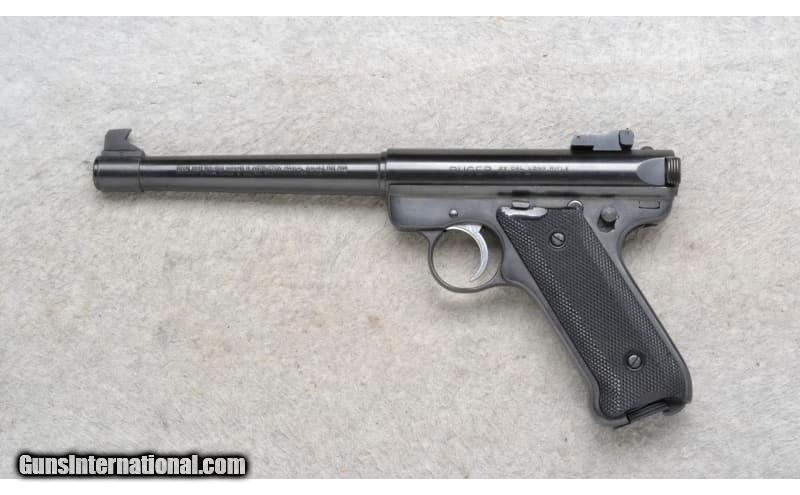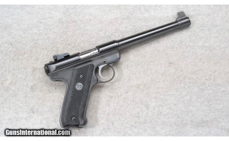 Description: This Ruger Model Mark II Target is a right hand semi-auto pistol in .22 Long Rifle Cal. It has a 6.75 inch barrel. A blade front sight and an adjustable notch rear sight. The grip is a checkered hard black plastic. It has a grooved trigger. .22 Long Rifle SOLD Chambers: 10 round magazine. Metal Condition: Excellent. Bore Condition: Excellent. Barrels: 6.75 inch barrel. Weight: 40 Oz. Sights: Blade front. Adjustable notch rear. Item Location: Richfield, WI |