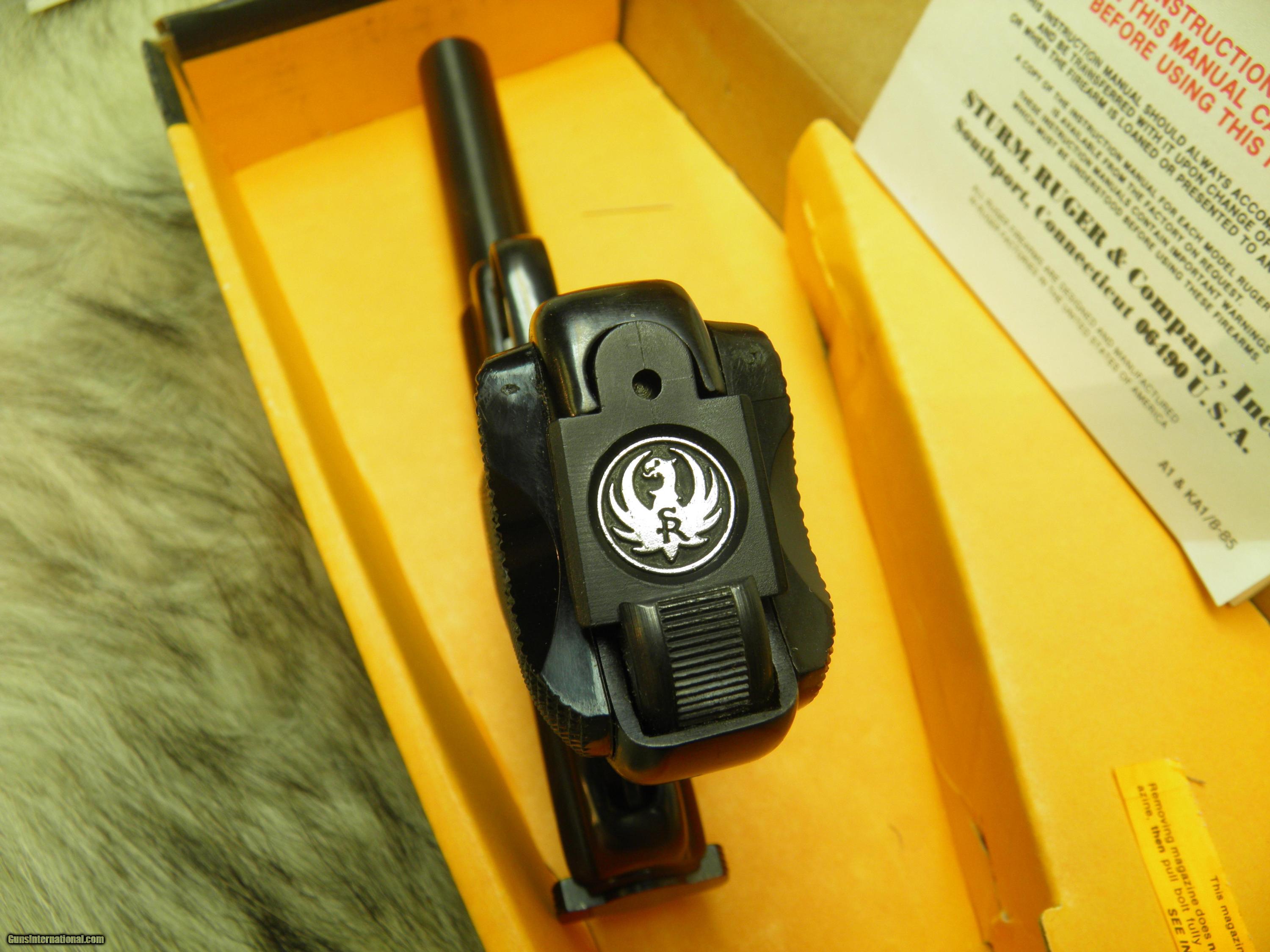 Description: RUGER MARK II TARGET PISTOL, 5 1/2" BULL BARREL, SIGHTS, FRONT BLADE PATRIDGE TYPE, REAR- CLICK ADJUSTMENT FOR WINDAGE AND ELEVATION, LIGHT CRISP TRIGGER, 10 ROUND MAGAZINE, BLACK CHECKERED GRIPS, WITH SILVER EAGLE, BEAUTIFUL HIGH POLISH BLUE FINISH. "CONDITION" NEW AND UNFIRED IN BOX, WITH ALL THE PAPER WORK, PLUS IT STILL HAS OUTER CARDBOARD BOX! SOLD |