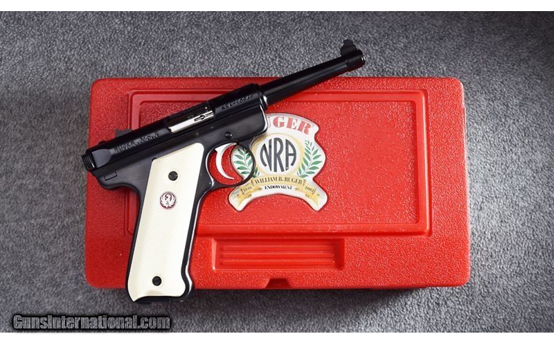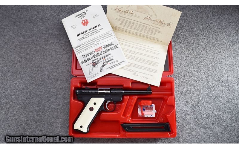 Description: This Ruger MK II was manufactured in 2003 and is a salute to the NRA Foundation "William B. Ruger Endowment" 1916-2002. Gun is in excellent condition and appears unfired. Complete with Red Plastic Case, manual and certificate of authenticity. Spent shell casing, 2 magazines and speed loader. Very Nice Gun! .22 Long Rifle SOLD Metal Condition: Excellent Bore Condition: Excellent Barrels: 4 3/4 Triggers: Factory Butt Pad: Checkered White Plastic Grips with Red Ruger Medallion Weight: 32 oz. Sights: Blade Front - Adjustable Square Notch Rear Item Location: Wheeling |