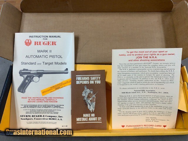Description: A nice original Ruger Mark II with the seldom seen standard 6 inch barrel. Pistol is excellent overall and original box is matching to the pistol. Nice Pistol! SOLD Handgun Caliber: .22 Long Rifle |