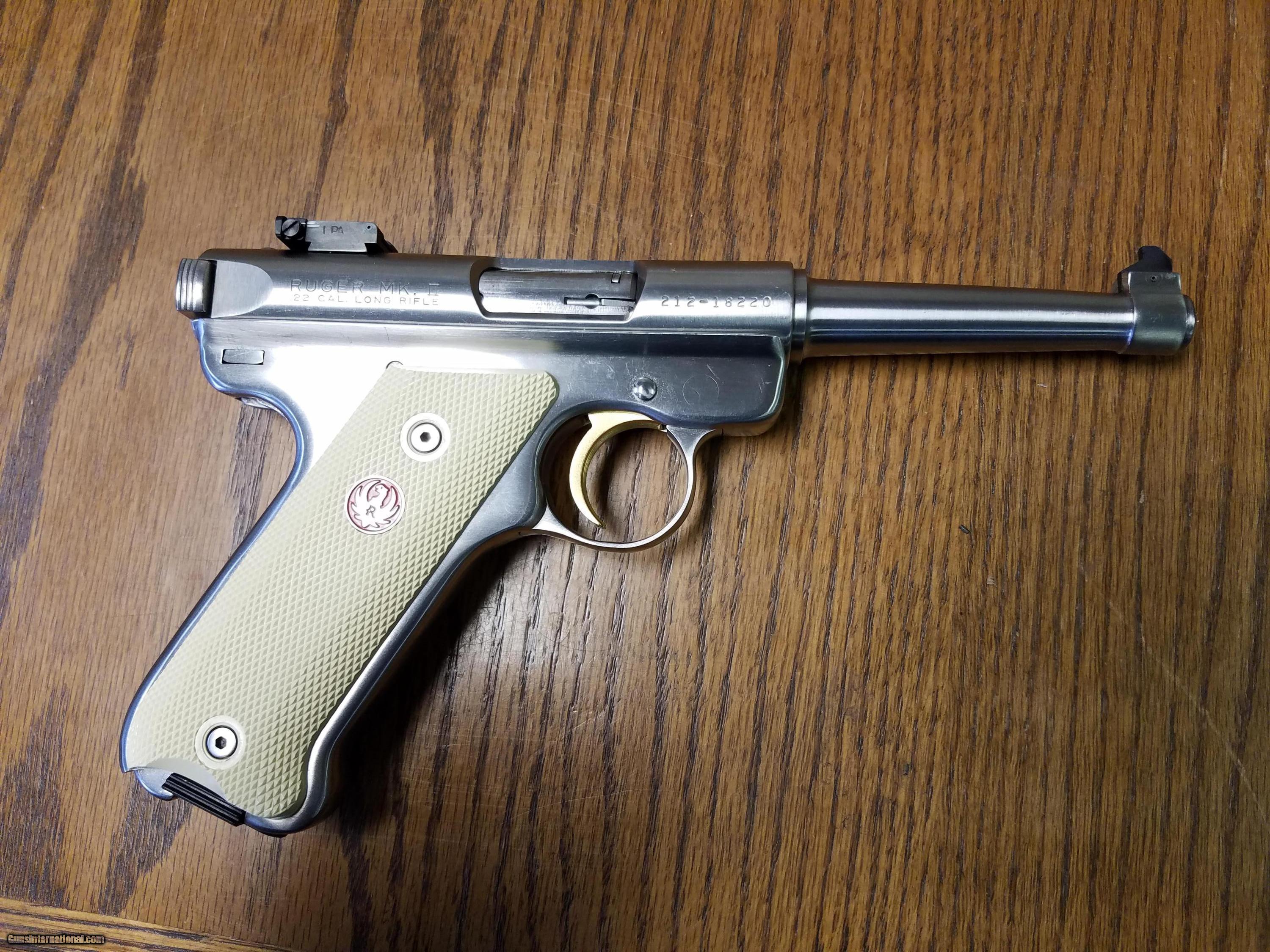Description: I think this pistol is a pretty odd duck. I haven't been able to find out much information about it. The gold trigger sets it apart. The gun dates back to about 1987. It has a 4 3/4" tapered stainless barrel. Give me a shout if you need more pictures. The pistol has not been shot or carried much. Please call or email with any questions. WE TAKE CREDIT CARDS, DEBIT CARDS, MONEY ORDERS, CASHIER CHECKS, OR EVEN PERSONAL CHECKS.........AS LONG AS THEY'RE GOOD! 3% will be added to all charge cards. GUNS WILL BE HELD UNTIL PERSONAL CHECKS CLEAR. GUNS SUBJECT TO PRIOR SALE. There is a $30 shipping charge per gun. Insurance will be extra. Thank you, Darryl Howard SOLD |