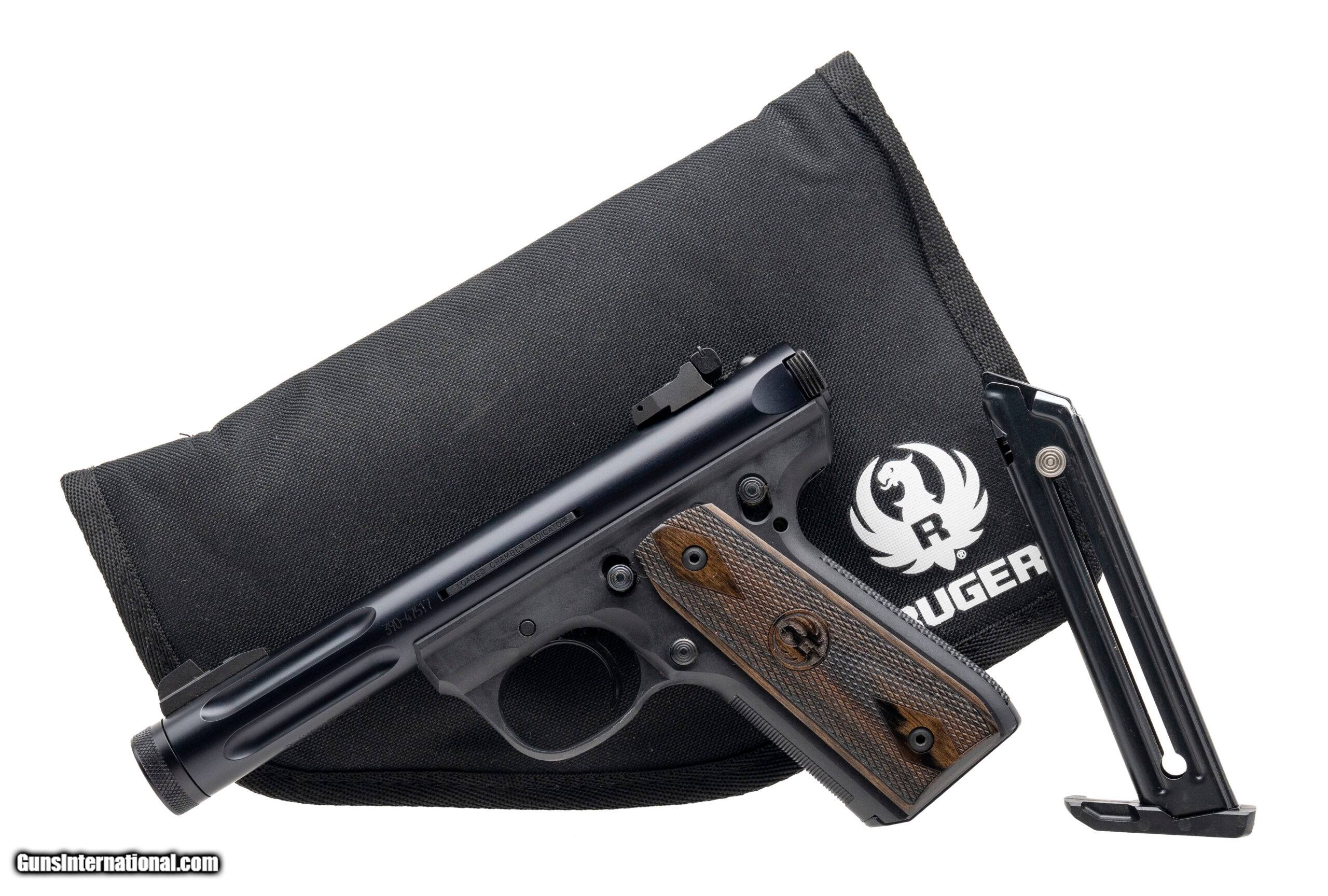 Description: "SN: 390-47517. Modern production, .22LR with a 4.5"" fluted threaded barrel. Bore is very god. Polymer frame semi-auto rimfire pistol with an adjustable rear sight, manual thumb-safety, matte black finish, checkered medallion wood grips, and black polymer frame. Includes additional magazine, scope mounting rail, and Ruger soft carry bag. Overall condition is excellent. Price: $399.95 Contact Seller |