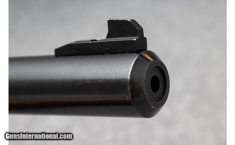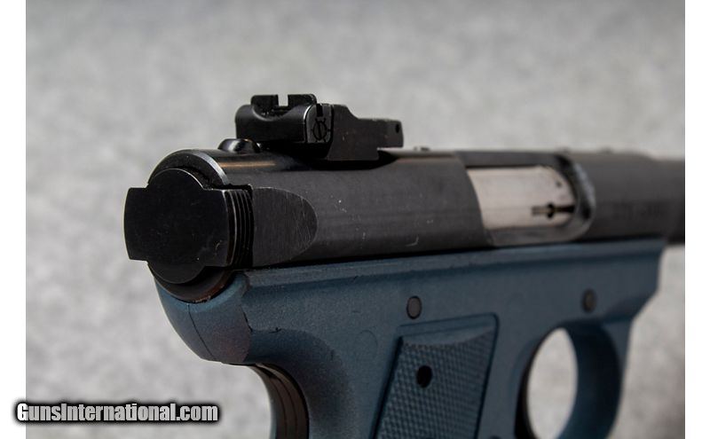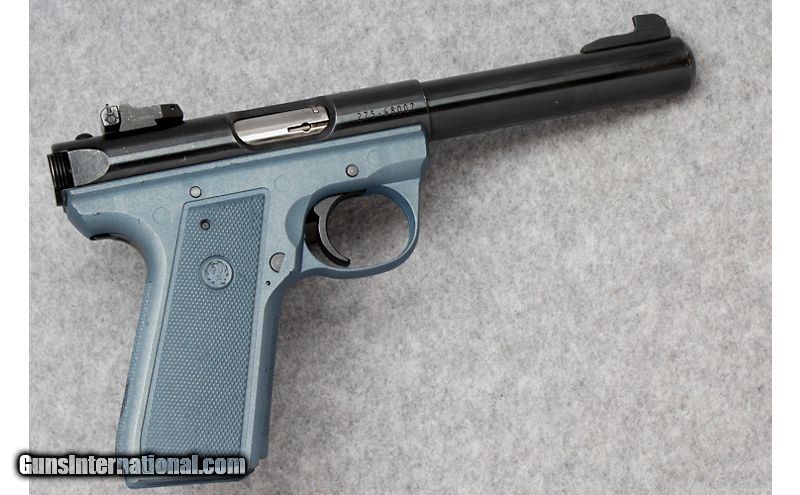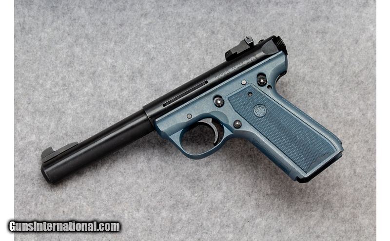 Description: "The Ruger 22/45 provides the feel of the classic 1911 pistol with the reliability and accuracy of Ruger's cylindrical bolt and fixed barrel construction." Features include a serrated front strap and checkered back strap, a loaded chamber indicator, a contoured ejection port, and easy-to-grasp bolt ears.This model's "internal cylindrical bolt construction ensures permanent sight to barrel alignment and higher accuracy potential than conventional moving-slide designs." -Ruger Titanium blue zytel polymer frame with manual safety on the left side. 2 lbs. .22 Long Rifle SOLD Chambers: 10 Round Magazine Metal Condition: Retains most of its bluing with some surface level scratches on the barrel. Bore Condition: Very Good Weight: 2 lb Item Location: Farmington, UT |