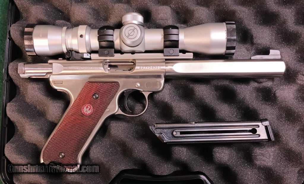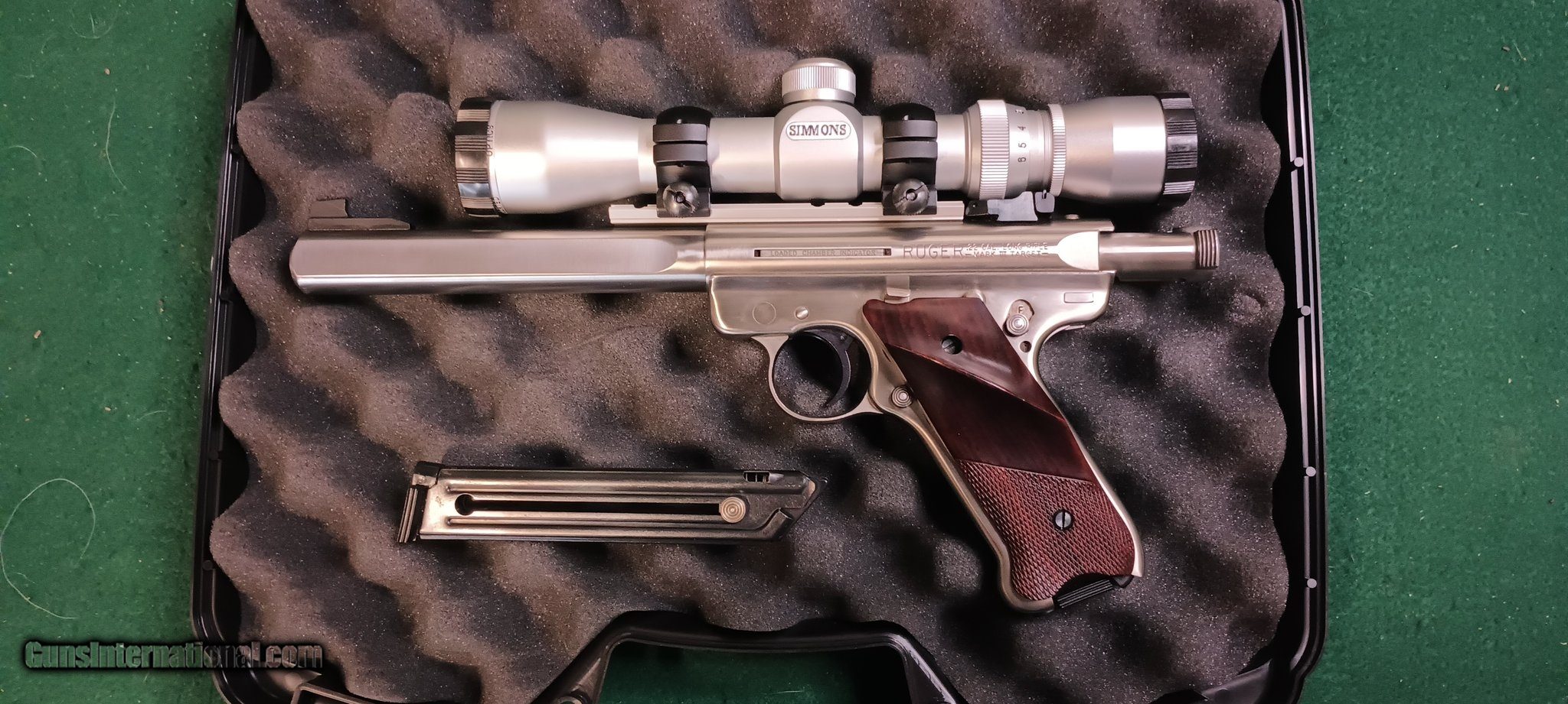 Description: Guns Listing ID: 1303609 This Ruger Mark III Target Competition slab side model has a 6.5\" barrel and comes with two 10rd. magazines. The gun is topped with a Weaver base, rings, and a Simmons Pro Hunter 2-6X32mm scope. Gun is in excellent condition. SOLD Manufacturer: RUGER Model: Mark III Target Competition Caliber Info: .22 LR Condition: Used - Non-Certified Barrels: 6.5 BARREL Finish: STAINLESS |