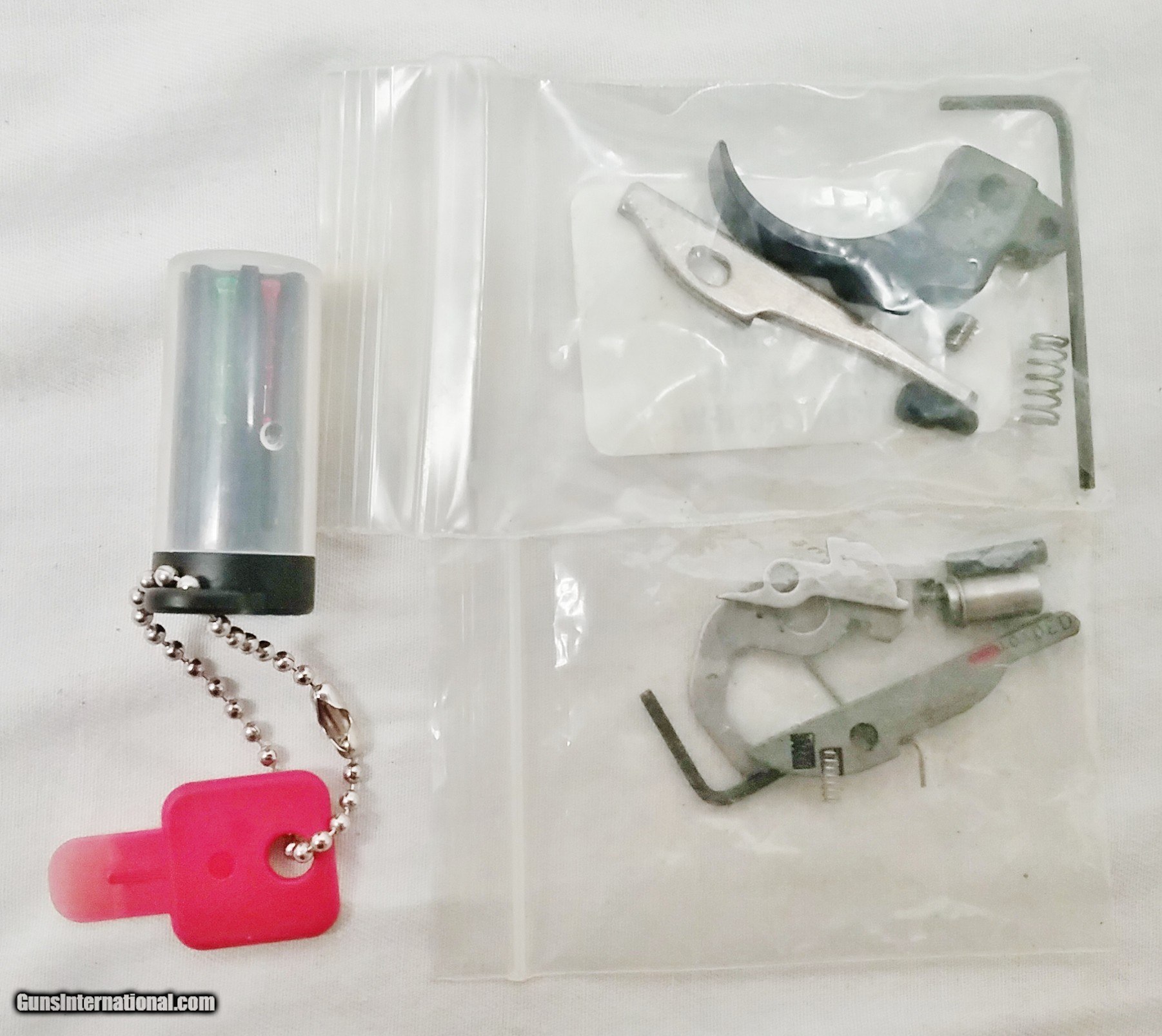 Description: This .22 LR Ruger MK III Hunter pistol has a 7” stainless fluted bull barrel. The bore is in very good condition. The pistol is mounted with a fixed green fiber optic front sight and a windage and elevation adjustable rear sight. The upper is drilled and tapped for a scope mount and fitted with filler screws. The semi-checkered Laminate grips are in very good condition. The pistol features an adjustable stainless steel Volquartsen trigger, a magazine disconnect disabler, stainless loaded chamber indicator filler, an after-market mainspring housing that allows easy field stripping, and a Volquartsen SureStrike firing pin. Included is the original trigger, firing pin, magazine disconnect safety, and loaded chamber indicator. The gun comes with two 10 round magazines, additional fiber optic inserts, factory papers and case. Weight is 3 lbs. Our stock number is #C143. Willing to ship to any FFL in the United States, buyer pays freight and insurance. SOLD Handgun Caliber: .22 Long Rifle Manufacturer: Ruger Model: MK III Hunter Bore: Rifled Condition: Very Good Metal Condition: Very Good Wood Condition: Very Good Bore Condition: Very Good Barrels: One Barrel Type: Fluted Bull Barrel Action: Semi-Automatic Triggers: One Finish: Stainless Steel Weight: 3 lbs Sights: Adjustable Extras: Read Description Case: Yes Item Location: OR |
