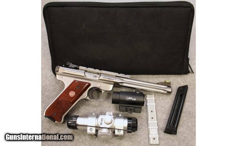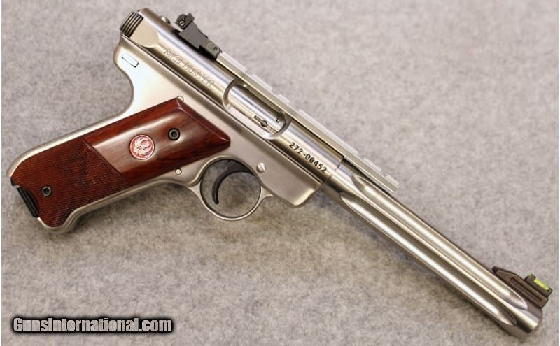 Description: This Ruger MKIII Hunter chambered in .22 LR features, stainless finish, fluted barrel, manual thumb safety, loaded chamber indicator, adjustable rear sight, fiber optic front sight, optic mount, and Ruger wood checkered grips. .22 Long Rifle SOLD Metal Condition: Excellent Wood Condition: Excellent Bore Condition: Bright Barrels: 7 Inches Weight: 2.6 lbs. Item Location: Hoffman Estates, IL |