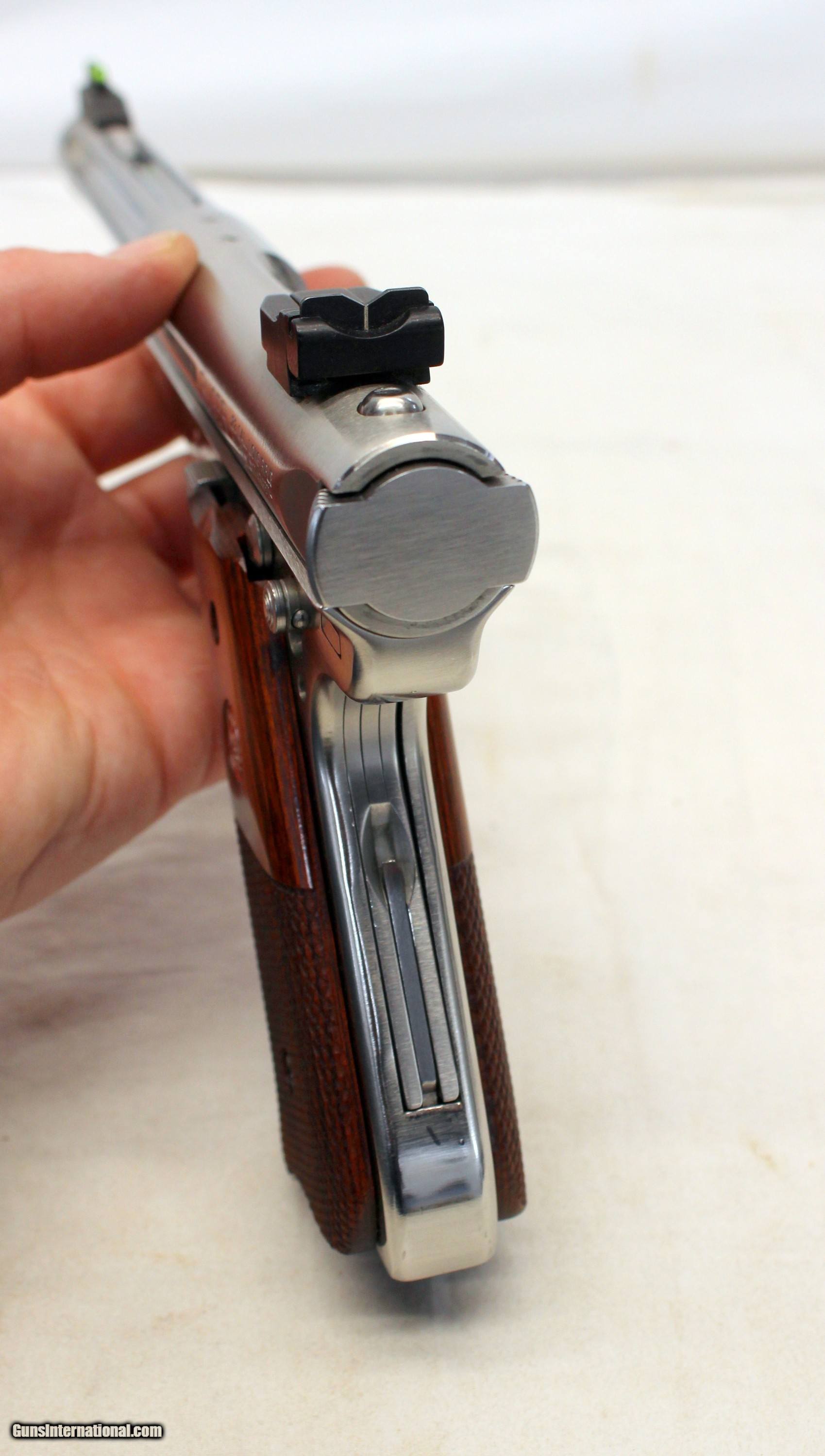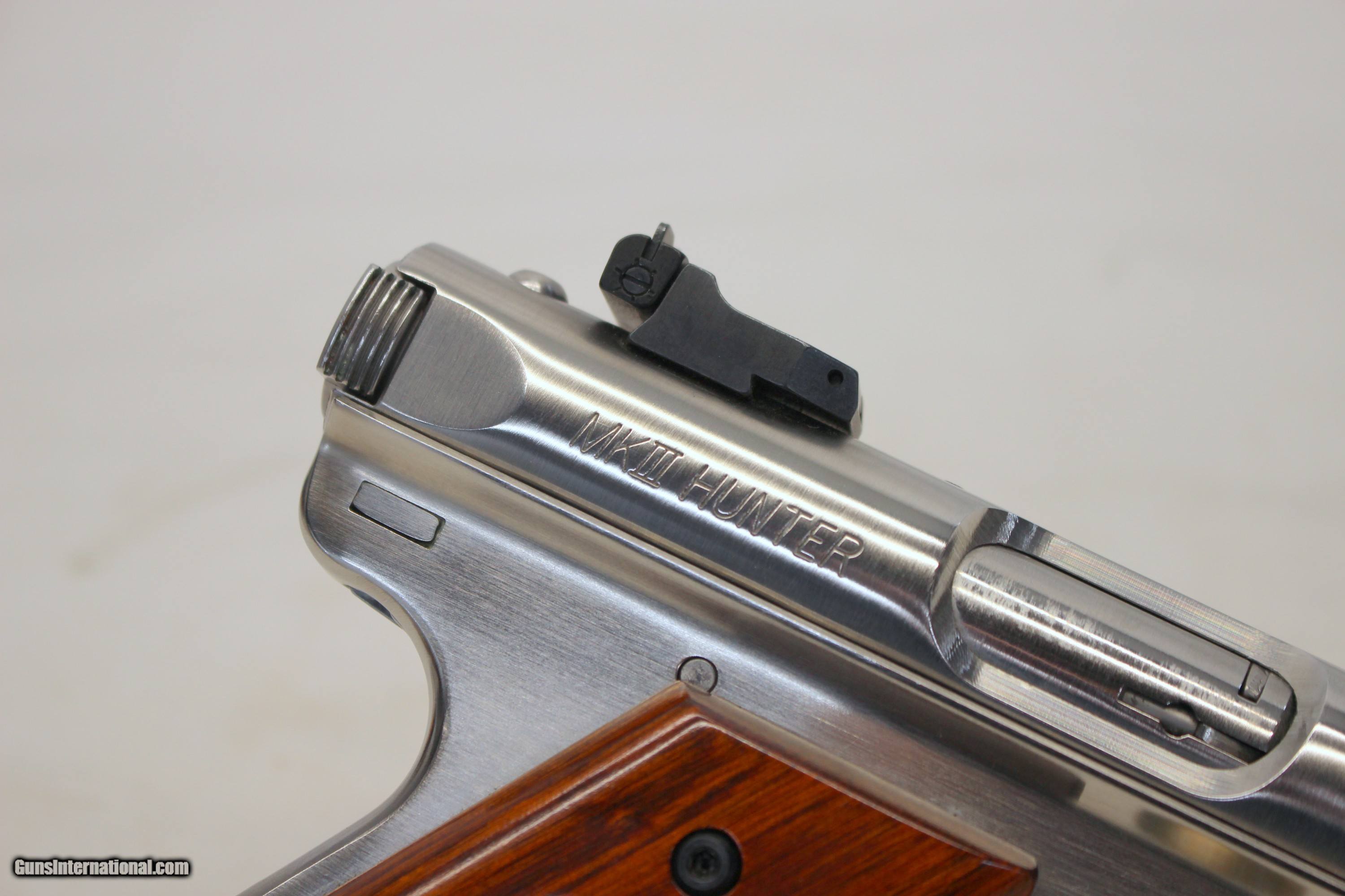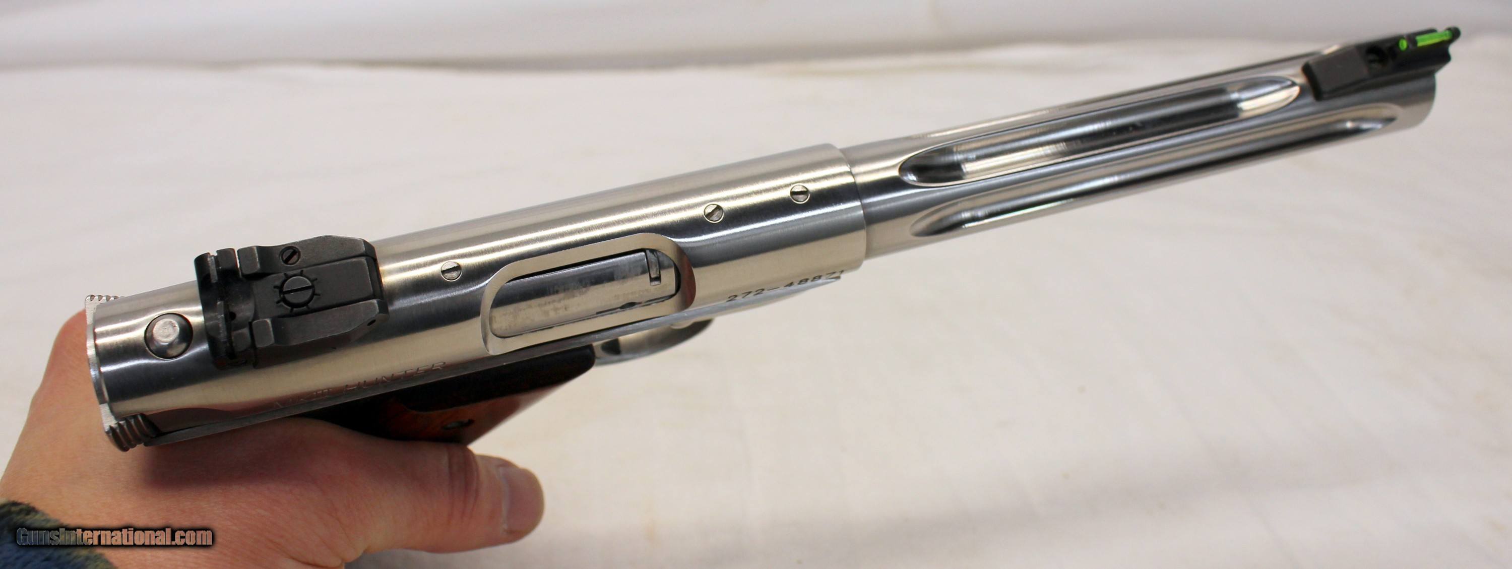 Description: We are offering for a sale a Ruger MKIII HUNTER semi-automatic pistol chambered in .22LR caliber. This is a HIGH CONDITION example with fluted barrel and wood grip panels. 6.75" fluted barrel is excellent with bright bore showing crisp rifling. Gun looks hardly used. Slide and frame are very good to excellent showing very little wear; Bright stainless finish. Gun functions flawlessly. The original wood grips are very good with light scattered hndling wear. VERY NICE EXAMPLE! SHIPPING IS $24.95 USPS PRIORITY WITH INSURANCE **** PLEASE NOTE: WE ONLY ACCEPT MASTERCARD AND VISA AS PAYMENT OPTIONS (please note we charge a non-negotiable 3% CC fee) **** **** WE TAKE CREDIT CARD PAYMENT OVER THE PHONE. WE DO NOT TAKE PAYMENT THROUGH THIS **** PLEASE LOOK AT ALL PHOTOGRAPHS FOR CONDITION Please know the legality of any weapon in your state before . If a gun can’t be transferred to you we will charge a 15% re-stocking fee. We are in the shop MODAY, WEDNESDAY, THURSDAY, FRIDAY and SATURDAY 8am-4pm EST. We will be in touch within 24 hours of your purchase. Please be ready to provide CC information. Please have your FFL email a copy of their license to: . No Face To Face Transfers! Please note: Clicking "buy" does not guarantee that this gun is yours, However clicking “Buy” will reserve this gun for you, if it hasn’t been sold in store. We will try to do our best to remove the posts as efficiently as possible, but sometimes delays may ensue. “Buy” is your safest bet to reserve a gun. Also please add 6.25% MA state sales tax (if from MA) and 3% credit card shop courtesy fee for all out of state buyers Before calling with concerns read these conditions and meet them accordingly. SOLD |