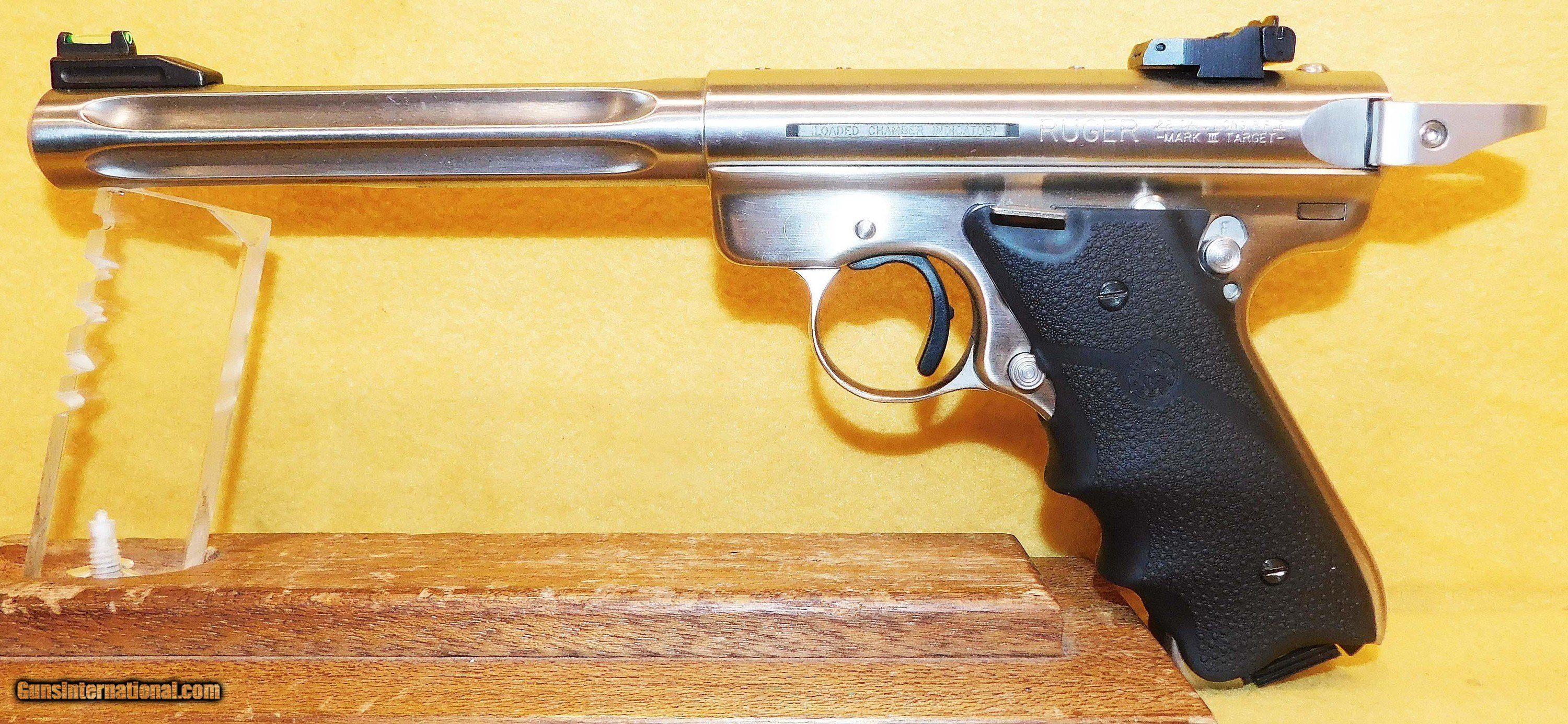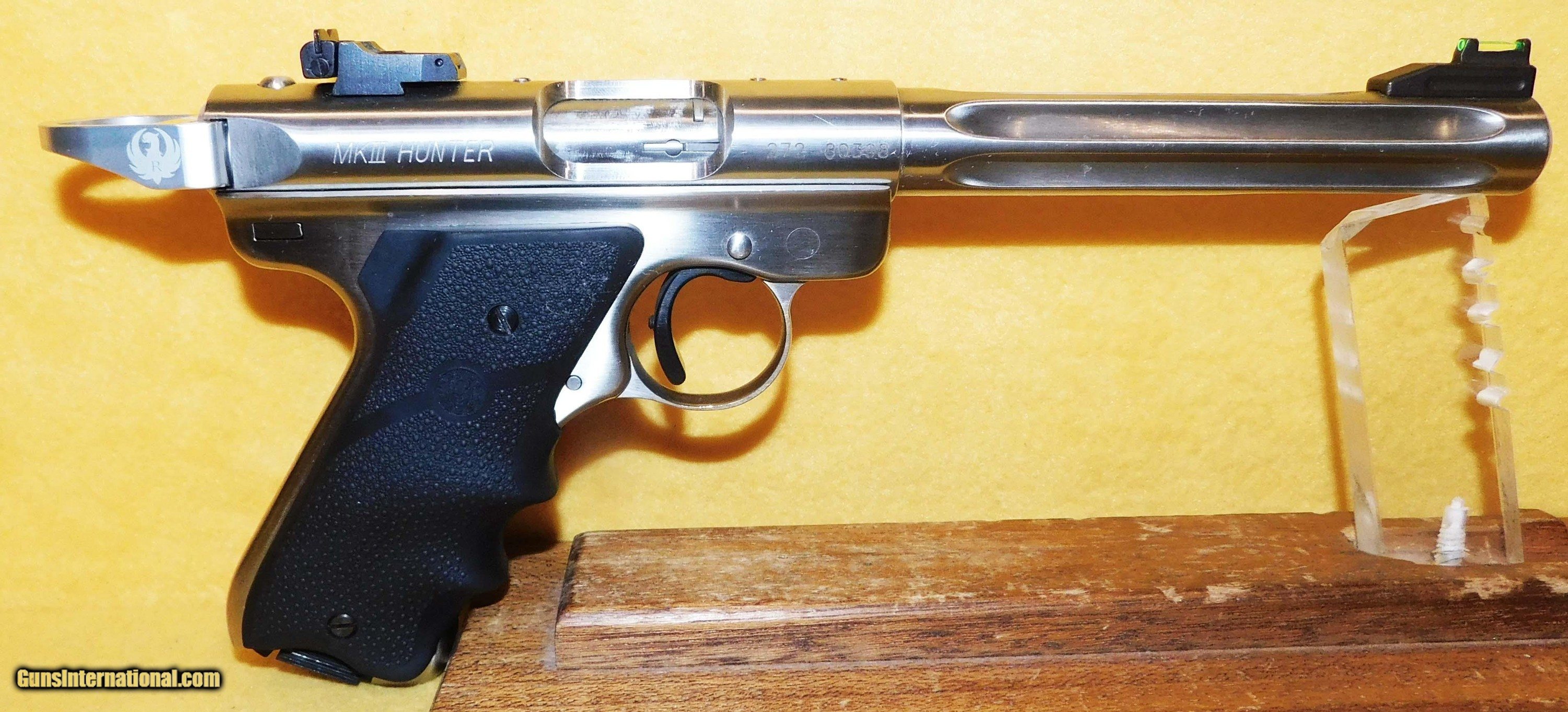 Description: RUGER MKIII HUNTER IN .22 L.R. CAL., WITH 8" BARREL. COLOR STAINLESS STEEL. CONDITION 98%. SERIAL NUMBER 272-80398. RUGER MODEL MKIII IN .22 L.R CALIBER, ROUND FLUTED BULL BARRELL WITH MIRROR BORE, FIBER OPTIC FRONT WITH ADJUST ABUL REAR SIGHT, HOUGE RUBBER GRIPS EXCELLENT, EXTENDED BOLT RELEASE, RUGER TARGET BOLT YOKE, VOLQUARTSEN TRIGGER GROUP, COMES WITH ONE FACTORY MAGAZINE, 98% OVERALL CONDITION, OUR STOCK # D3448 SOLD |