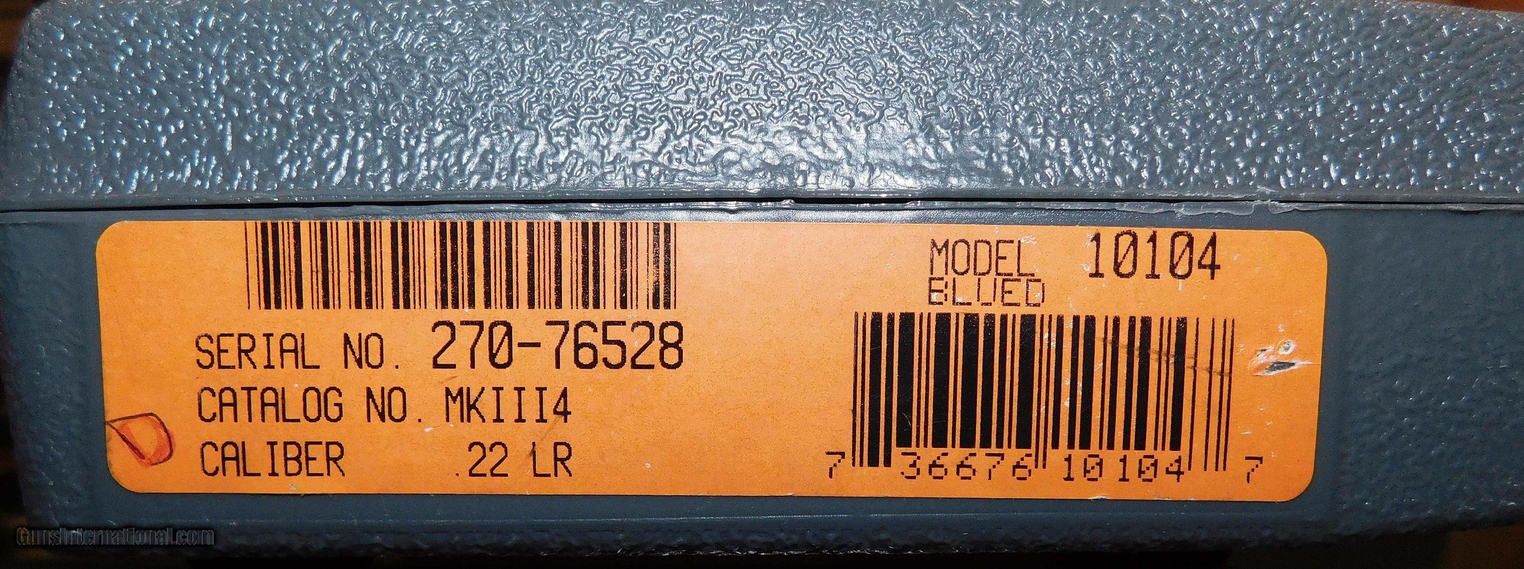 Description: RUGER MKIII IN .22 L.R. CAL., WITH 5" BARREL. COLOR BLUE. CONDITION 98% LIKE NEW UNFIRED. SERIAL NUMBER 270-76528. RUGER MODEL MKIII IN .22 L.R. CALIBER, FIXED REAR SIGHT, COMES WITH ONE FACTORY MAGAZINE, HARD CASE WITH PAPERS, 98% LIKE NEW UNFIRED OVERALL CONDITION, OUR STOCK # D3105 SOLD |
