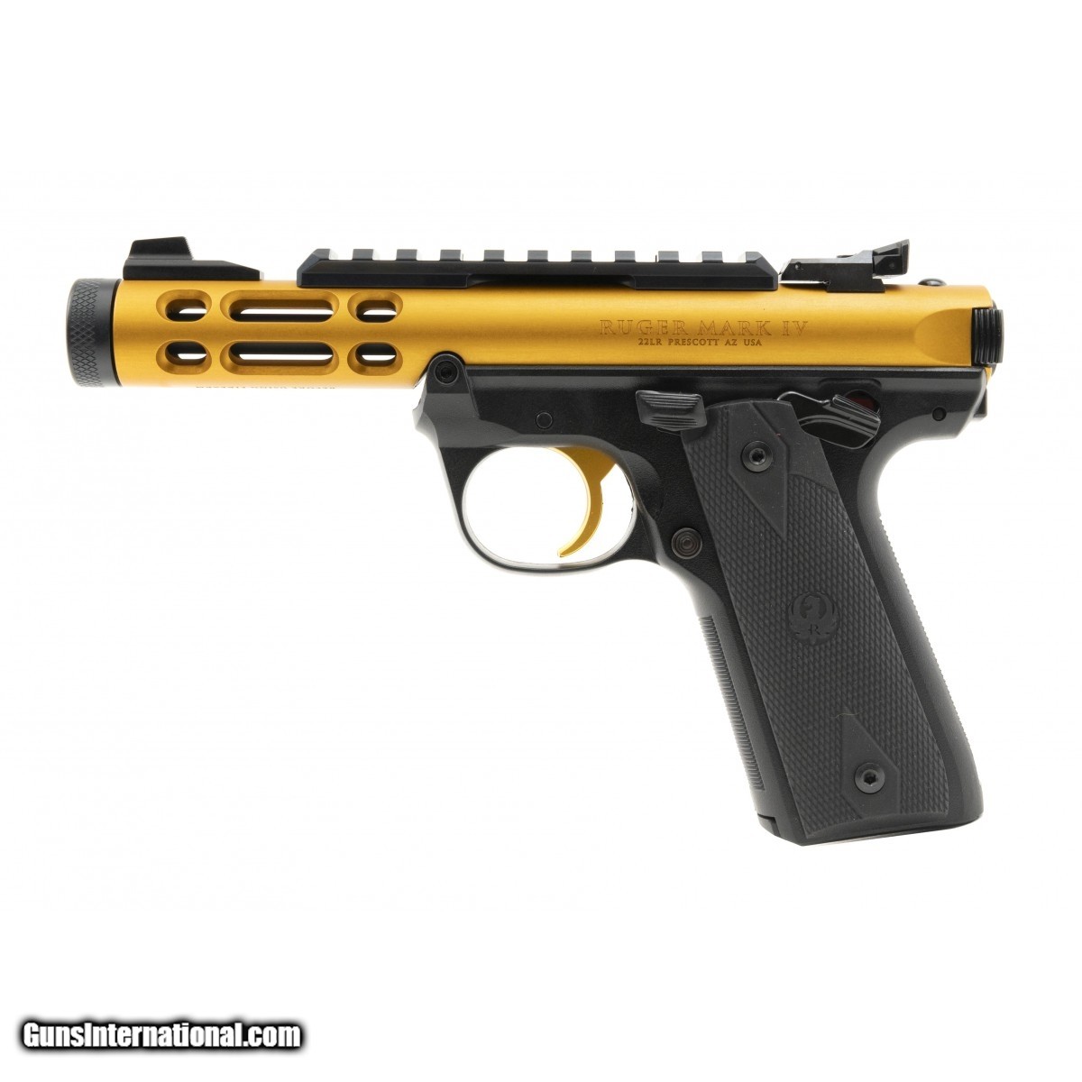 Description: " Ruger, Mark IV lite 22 semi-automatic 22lr, 4.4"" threaded barrel, polymer frame, gold anodized finish, checkered grips, 10rd, adjustable rear sight. NEW UPC:736676439263 (Stock Photo) SOLD |