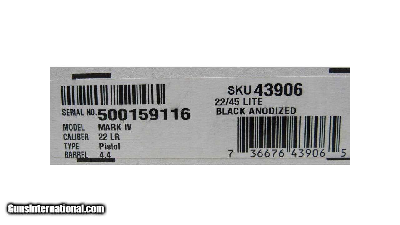 Description: Guns Listing ID: 580539 RUGER MARK IV 22/45 LITE 22LR 10-ROUND MAG 4.4\" BARREL STRIKER-FIRED SEMI-AUTO PISTOL INCLUDES RUGER BOX W/ OWNER‚‚S MANUAL + 1 ADDITIONAL MAGAZINE The Ruger Mark IV 22/45 Lite is perfect for plinking and target shooting. This handgun is chambered in 22 LR, has a 4.4-inch barrel, and comes with two 10-round magazines. With a Diamond Gray anodized finish, it features checkered 1911-style grips, a fixed front sight, and an adjustable rear sight SOLD Manufacturer: RUGER Model: Mark IV 22/45 Lite Caliber Info: 22 LR Condition: Used - Non-Certified Barrels: 4.4 BARREL Finish: GRAY |