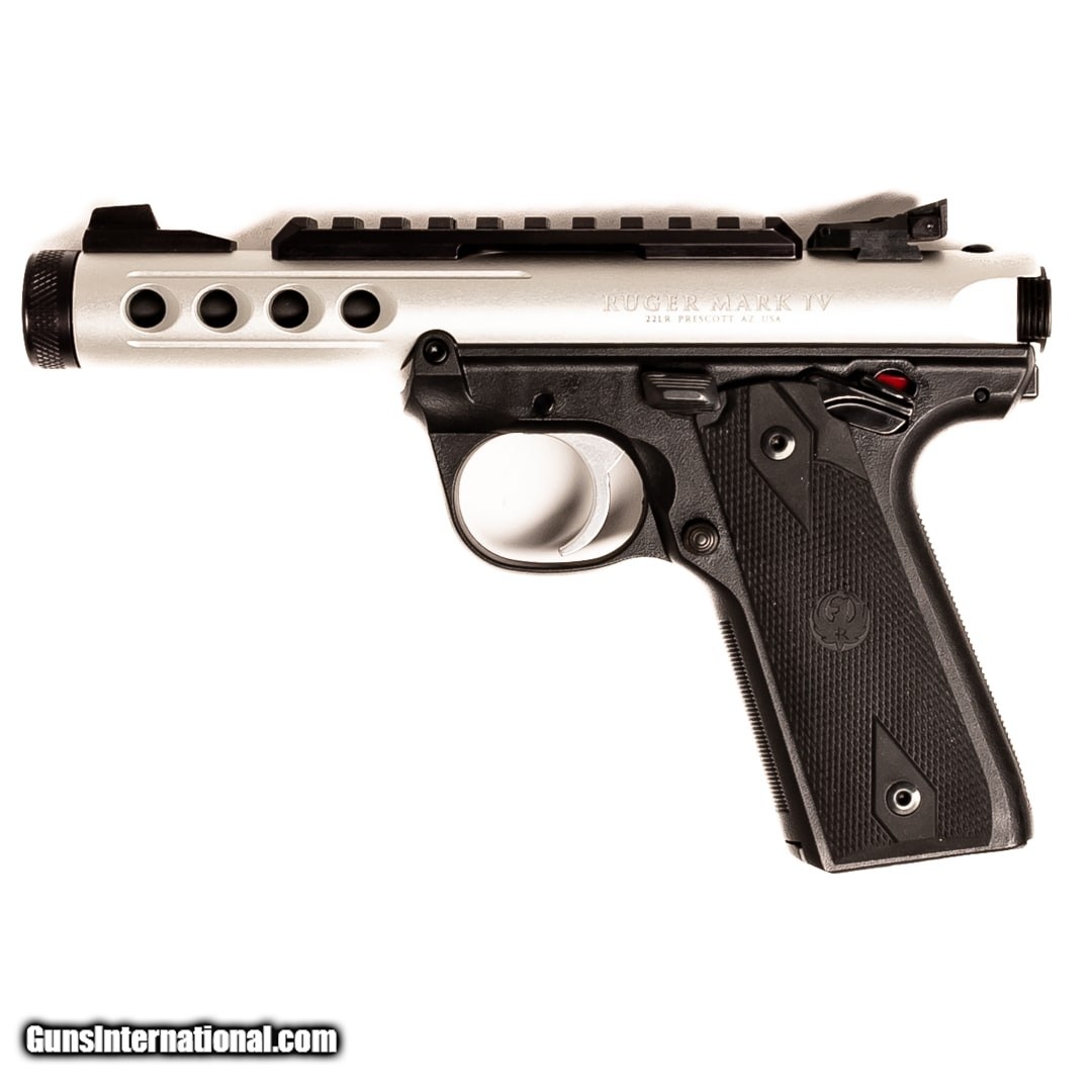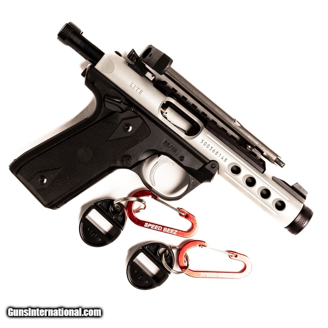 Description: Guns Listing ID: 798423 An excellent plinking and small game hunting pistol, this Ruger Mark IV 22/45 Lite is chambered in 22 LR and features a threaded barrel and optics rail. The 22/45 is a reference to a 22-caliber pistol with the ergonomics and controls of the classic 1911 (chambered in 45). The Mark IV is the most recent addition to the popular Ruger Mark series and has a reputation for accuracy and reliability. The fourth-generation (IV) features a simple one-button takedown for easy disassembly and cleaning. This Mark IV 22/45 Lite has a safety and a magazine disconnect. Purchase includes the original case, manual, two 10-round magazines, and two speed loaders. Get the best bang for your buck when you get a Certified Used Firearm . When you see the Certified Used stamp on any of our firearms, you can be confident that you’re getting exactly what you want – a gun only in very good to excellent condition and held to the highest quality standard. All Certified Used Guns come with a ‘no questions asked’ return policy . PLUS, ALL CERTIFIED USED GUNS SHIP FREE! SOLD Manufacturer: RUGER Model: MARK IV 22/45 LITE Caliber Info: .22 LR Condition: Used - Certified Barrels: 4.5 BARREL Finish: TWO-TONE |