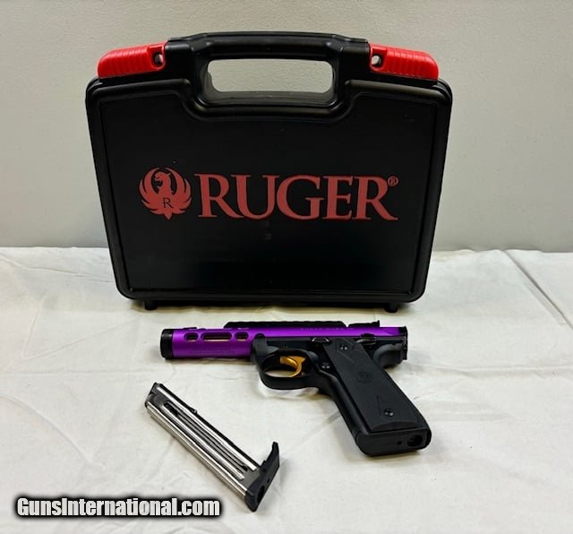 Description: Guns Listing ID: 1407760 Excellent condition w. box and 2 mags. FEATURES: MODEL:Mark IV 22/45 Lite TYPE:Semi-Auto Pistol ACTION:Single Action FINISH:Purple Anodized STOCK/FRAME:Polymer Frame STOCK/GRIPS:Checkered Black Rubber SPC FEATURE:Threaded Barrel Model WEIGHT:25 oz. CALIBER/GAUGE:22 LR CAPACITY:10+1 # OF MAGS:2 MAGAZINE DESC:10 rd. BARREL:4.4\" OVERALL LENGTH:8.4\" RATE-OF-TWIST:1-in-16\" SIGHTS:Fixed Front/Adjustable Rear SAFETY:Ambidextrous Manual Safety ADDL INFO:Optics Rail Included ADDL INFO:Gold Barrel & Trigger ADDL INFO:Ventilated Purple Alum Upper DRILLED/TAPPED:Yes SOLD Manufacturer: RUGER Model: Mark IV Caliber Info: .22 LR Condition: Used - Non-Certified Barrels: 4.4 BARREL Finish: PURPLE |