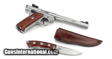 Description: Ruger Mark IV Competition William B Ruger 100th Birthday-Simple, one-button takedown for quick and easy field-stripping and proper chamber to muzzle cleaning. -A recessed button in the back of the frame allows the upper receiver to tilt up and off of the grip frame without the use of tools. -Ergonomic bolt stop. -Internal cylindrical bolt construction ensures permanent sight to barrel alignment and higher accuracy potential than conventional moving slide designs. -Contoured ejection port and easy-to-grasp bolt ears allow for durable and reliable operation round after round. -Accurate sighting system features adjustable rear sight and drilled and tapped receiver for Weaver- or Picatinny-style rail for easy mounting of optics. -Ambidextrous manual safety positively locks the sear in the "SAFE" position when applied. Safety can be converted to left-side only with included washer. -Features a conveniently located push-button magazine release on the left side of the frame. -Magazine drops free on release for faster reloading. -Magazine disconnect prevents discharge when the magazine has been removed. -Also includes: two, 10-round magazines. -Smooth and polished laminate grips. -Custom "100 Years" and William B. Ruger signature laser engraving on barrel. -Limited quantity of 1000 made with special WBR serial number. -Includes Ruger® Centennial Knife from CRKT® with matching serial number. Made in USA. -Front fixed sights. Rear adjustable sights. -Drilled and Tapped receiver